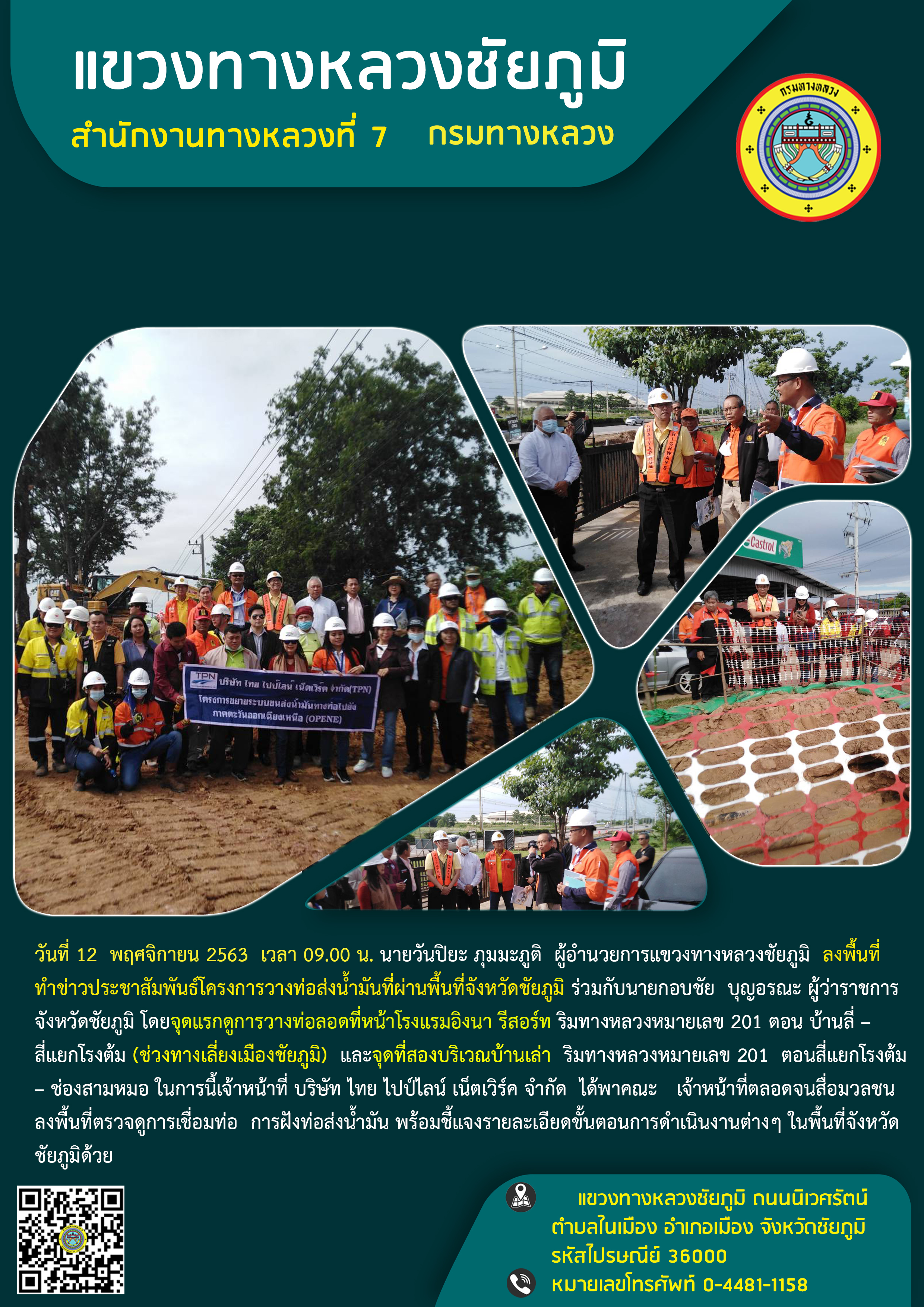 วันที่ 12 พฤศจิกายน 2563 เวลา 09.00 น. นายวันปิยะ ภุมมะภูติ ผู้อำนวยการแขวงทางหลวงชัยภูมิ ลงพื้นที่ทำข่าวประชาสัมพันธ์โครงการวางท่อส่งน้ำมันที่ผ่านพื้นที่จังหวัดชัยภูมิ ร่วมกับนายกอบชัย บุญอรณะ ผู้ว่าราชการจังหวัดชัยภูมิ โดยจุดแรกดูการวางท่อลอดที่หน้าโรงแรมอิงนา รีสอร์ท ริมทางหลวงหมายเลข 201 ตอน บ้านลี่ – สี่แยกโรงต้ม (ช่วงทางเลี่ยงเมืองชัยภูมิ) และจุดที่สองบริเวณบ้านเล่า ริมทางหลวงหมายเลข 201 ตอนสี่แยกโรงต้ม – ช่องสามหมอ ในการนี้เจ้าหน้าที่ บริษัท ไทย ไปป์ไลน์ เน็ตเวิร์ค จำกัด ได้พาคณะ เจ้าหน้าที่ตลอดจนสื่อมวลชน ลงพื้นที่ตรวจดูการเชื่อมท่อ การฝังท่อส่งน้ำมัน พร้อมชี้แจงรายละเอียดขั้นตอนการดำเนินงานต่างๆ ในพื้นที่จังหวัด