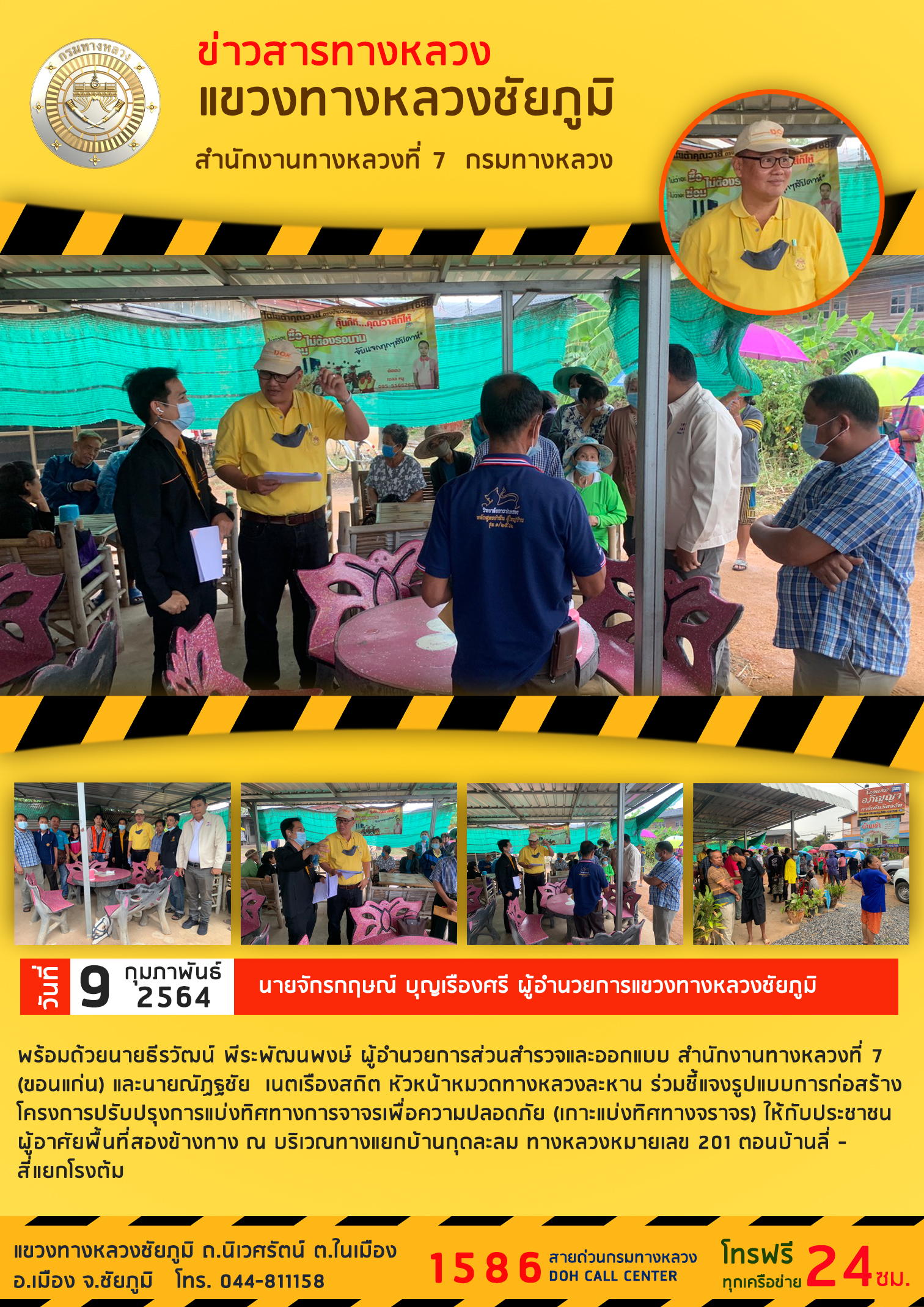 วันที่ 9 กุมภาพันธ์ 2564 นายจักรกฤษณ์ บุญเรืองศรี ผู้อำนวยการแขวงทางหลวงชัยภูมิ พร้อมด้วยนายธีรวัฒน์ พีระพัฒนพงษ์ ผู้อำนวยการส่วนสำรวจและออกแบบ สำนักงานทางหลวงที่ 7 (ขอนแก่น) และนายณัฏฐชัย เนตเรืองสถิต หัวหน้าหมวดทางหลวงละหาน ร่วมชี้แจงรูปแบบการก่อสร้างโครงการปรับปรุงการแบ่งทิศทางการจาจรเพื่อความปลอดภัย (เกาะแบ่งทิศทางจราจร) ให้กับประชาชนผู้อาศัยพื้นที่สองข้างทาง ณ บริเวณทางแยกบ้านกุดละลม ทางหลวงหมายเลข 201 ตอนบ้านลี่ - สี่แยกโรงต้ม