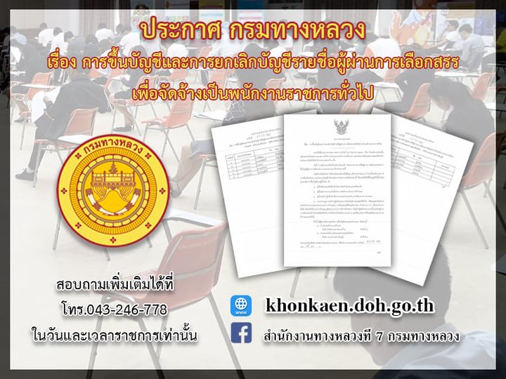 มารายงานตัวเพื่อรับการจัดจ้างเป็นพนักงานราชการทั่วไป ณ ฝ่ายบริหารงานทั่วไป สำนักงานทางหลวงที่ 7 ตำบลในเมือง อำเภอเมือง จังหวัดขอนแก่น