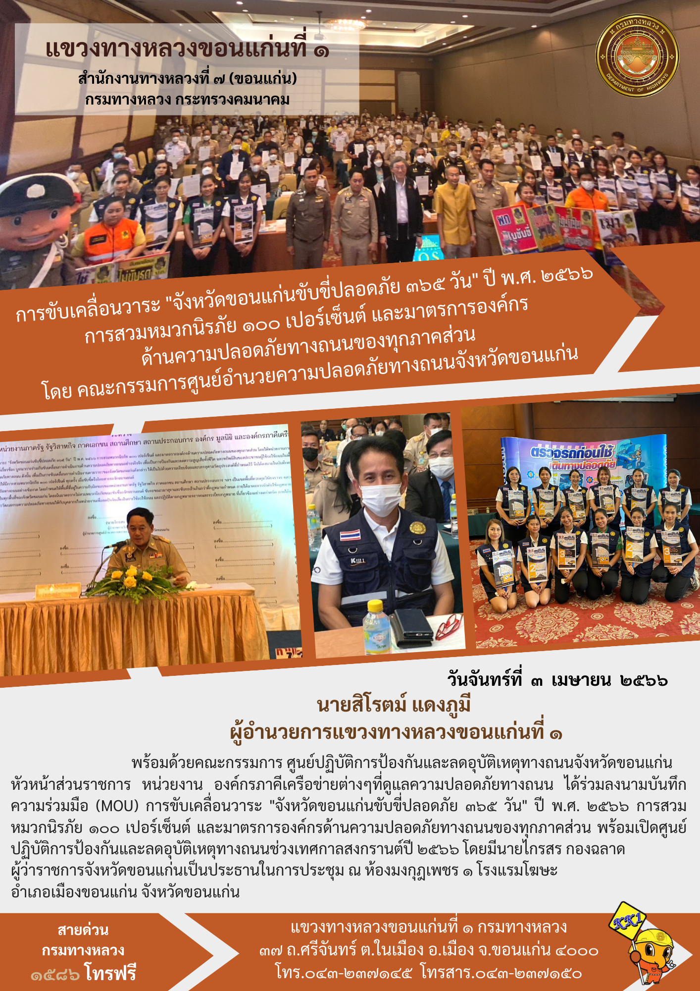 วันจันทร์ที่ 3 เมษายน 2566 เวลา 13:30 น. นายสิโรตม์ แดงภูมี ผู้อำนวยการแขวงทางหลวงขอนแก่นที่ 1 พร้อมด้วยคณะกรรมการ ศูนย์ปฏิบัติการป้องกันและลดอุบัติเหตุทางถนนจังหวัดขอนแก่นหัวหน้าส่วนราชการ หน่วยงาน องค์กรภาคีเครือข่ายต่างๆที่ดูแลความปลอดภัยทางถนน ได้ร่วมลงนามบันทึกความร่วมมือ (MOU) การขับเคลื่อนวาระ "จังหวัดขอนแก่นขับขี่ปลอดภัย 365 วัน" ปี พ.ศ. 2566 การสวมหมวกนิรภัย 100 เปอร์เซ็นต์ และมาตรการองค์กรด้านความปลอดภัยทางถนนของทุกภาคส่วน พร้อมเปิดศูนย์ปฏิบัติการป้องกันและลดอุบัติเหตุทางถนนช่วงเทศกาลสงกรานต์ปี 2566 โดยมีนายไกรสร กองฉลาด ผู้ว่าราชการจังหวัดขอนแก่น เป็นประธานในการประชุม ณ ห้องมงกุฎเพชร 1 โรงแรมโฆษะ อำเภอเมืองขอนแก่น จังหวัดขอนแก่น