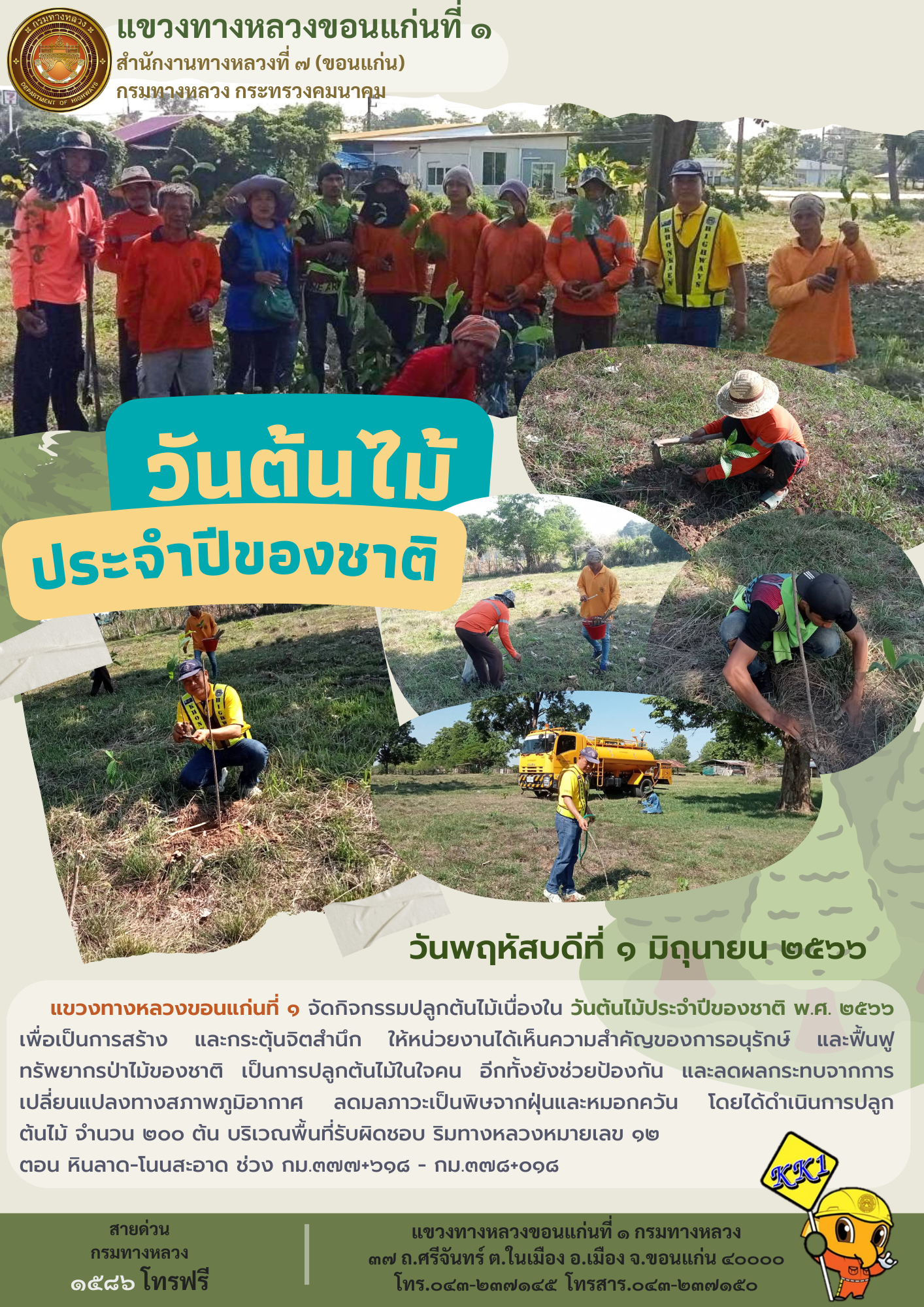 แขวงทางหลวงขอนแก่นที่ 1 จัดกิจกรรมปลูกต้นไม้เนื่องใน วันต้นไม้ประจำปีของชาติ พ.ศ. 2566 เพื่อเป็นการสร้าง และกระตุ้นจิตสำนึก ให้หน่วยงานได้เห็นความสำคัญของการอนุรักษ์ และฟื้นฟูทรัพยากรป่าไม้ของชาติ เป็นการปลูกต้นไม้ในใจคน อีกทั้งยังช่วยป้องกัน และลดผลกระทบจากการเปลี่ยนแปลงทางสภาพภูมิอากาศ ลดมลภาวะเป็นพิษจากฝุ่นและหมอกควัน โดยได้ดำเนินการปลูกต้นไม้ จำนวน 200 ต้น บริเวณพื้นที่รับผิดชอบ ริมทางหลวงหมายเลข 12 ตอน หินลาด-โนนสะอาด ช่วง กม.377+618 - กม.378+018