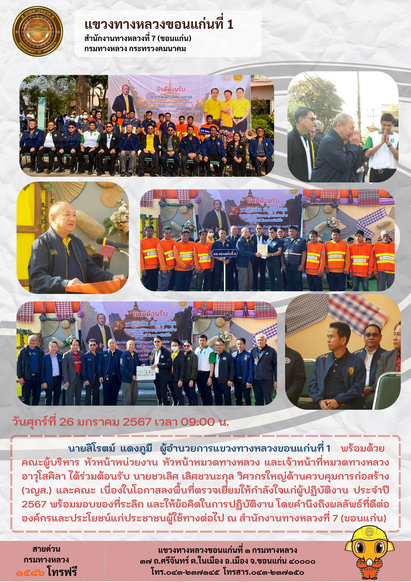 วันศุกร์ที่ 26 มกราคม 2567 เวลา 09:00 น. นายสิโรตม์ แดงภูมี ผู้อำนวยการแขวงทางหลวงขอนแก่นที่ 1 พร้อมด้วยคณะผู้บริหาร หัวหน้าหน่วยงาน หัวหน้าหมวดทางหลวง และเจ้าหน้าที่หมวดทางหลวงอาวุโสศิลา ได้ร่วมต้อนรับ นายชวเลิศ เลิศชวนะกุล วิศวกรใหญ่ด้านควบคุมการก่อสร้าง (วญส.) และคณะ เนื่องในโอกาสลงพื้นที่ตรวจเยี่ยมให้กำลังใจแก่ผู้ปฏิบัติงาน ประจำปี 2567 พร้อมมอบของที่ระลึก และให้ข้อคิดในการปฏิบัติงาน โดยคำนึงถึงผลลัพธ์ที่ดีต่อองค์กรและประโยชน์แก่ประชาชนผู้ใช้ทางต่อไป ณ สำนักงานทางหลวงที่ 7 (ขอนแก่น)