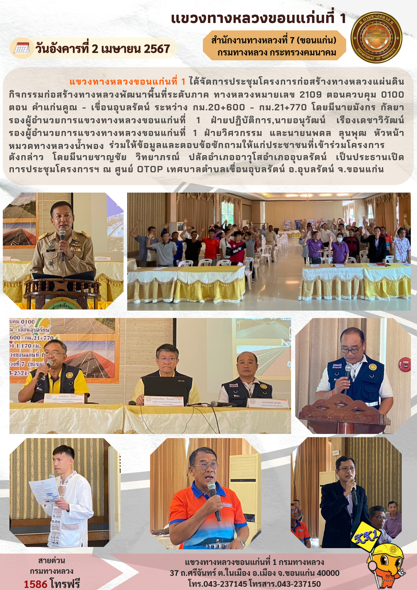 ขวงทางหลวงขอนแก่นที่ 1 ได้จัดการประชุมโครงการก่อสร้างทางหลวงแผ่นดินกิจกรรมก่อสร้างทางหลวงพัฒนาพื้นที่ระดับภาค ทางหลวงหมายเลข 2109 ตอนควบคุม 0100 ตอน คำแก่นคูณ - เขื่อนอุบลรัตน์ ระหว่าง กม.20+600 - กม.21+770 โดยมีนายมังกร กัลยา รองผู้อำนวยการแขวงทางหลวงขอนแก่นที่ 1 ฝ่ายปฏิบัติการ,นายอนุวัฒน์ เรืองเดชาวิวัฒน์ รองผู้อำนวยการแขวงทางหลวงขอนแก่นที่ 1 ฝ่ายวิศวกรรม และนายนพดล ลุนพุฒ หัวหน้าหมวดทางหลวงน้ำพอง ร่วมให้ข้อมูลและตอบข้อซักถามให้แก่ประชาชนที่เข้าร่วมโครงการดังกล่าว โดยมีนายชาญชัย วิทยาภรณ์ ปลัดอำเภออาวุโสอำเภออุบลรัตน์ เป็นประธานเปิด การประชุมโครงการฯ ณ ศูนย์ OTOP เทศบาลตำบลเขื่อนอุบลรัตน์ อ.อุบลรัตน์ จ.ขอนแก่น