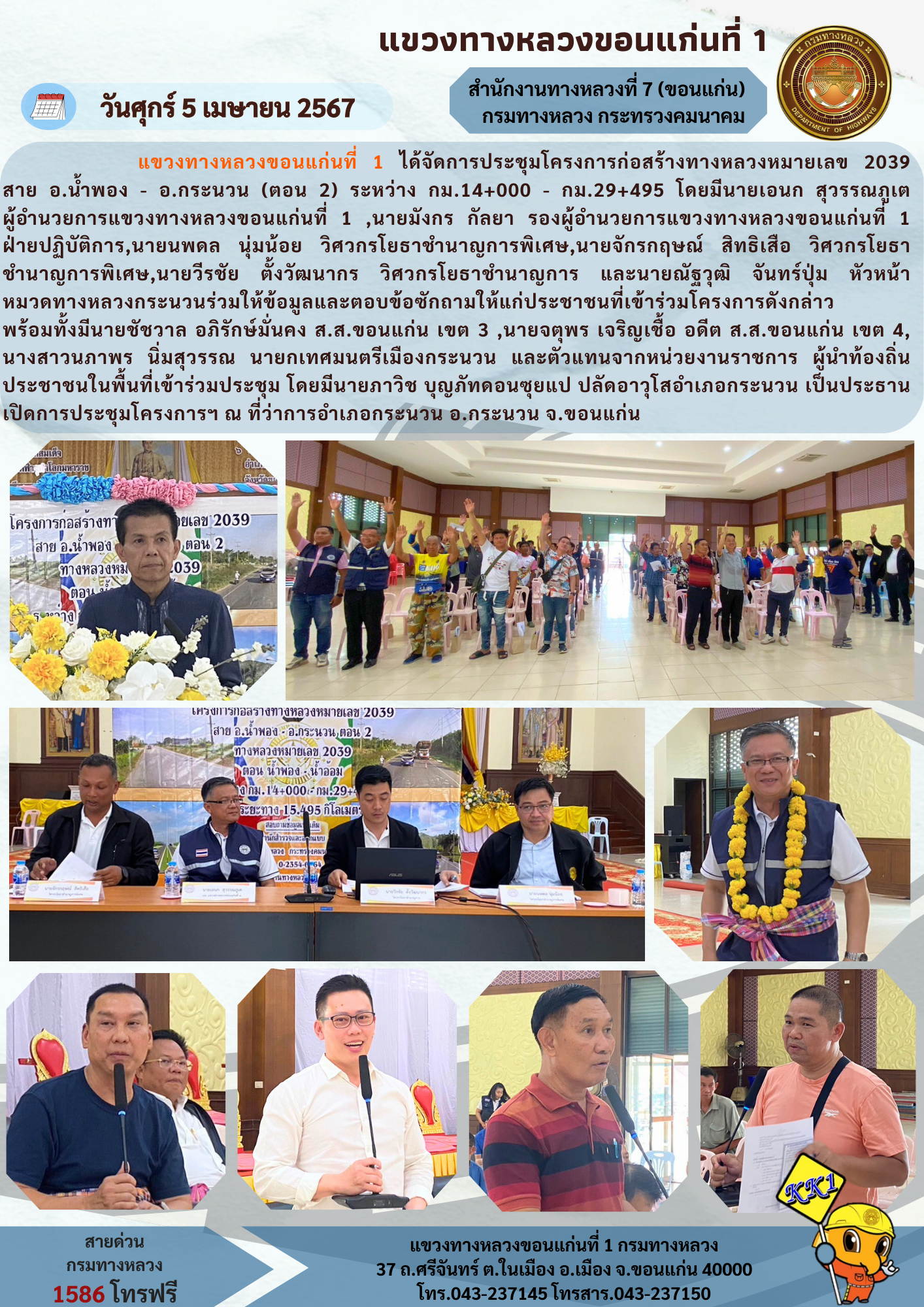 แขวงทางหลวงขอนแก่นที่ 1 ได้จัดการประชุมโครงการก่อสร้างทางหลวงหมายเลข 2039 สาย อ.น้ำพอง - อ.กระนวน (ตอน 2) ระหว่าง กม.14+000 - กม.29+495 โดยมีนายเอนก สุวรรณภูเต ผู้อำนวยการแขวงทางหลวงขอนแก่นที่ 1 ,นายมังกร กัลยา รองผู้อำนวยการแขวงทางหลวงขอนแก่นที่ 1 ฝ่ายปฏิบัติการ,นายนพดล นุ่มน้อย วิศวกรโยธาชำนาญการพิเศษ,นายจักรกฤษณ์ สิทธิเสือ วิศวกรโยธาชำนาญการพิเศษ,นายวีรชัย ตั้งวัฒนากร วิศวกรโยธาชำนาญการ และนายณัฐวุฒิ จันทร์ปุ่ม หัวหน้า หมวดทางหลวงกระนวนร่วมให้ข้อมูลและตอบข้อซักถามให้แก่ประชาชนที่เข้าร่วมโครงการดังกล่าว พร้อมทั้งมีนายชัชวาล อภิรักษ์มั่นคง ส.ส.ขอนแก่น เขต 3 ,นายจตุพร เจริญเชื้อ อดีต ส.ส.ขอนแก่น เขต 4, นางสาวนภาพร นิ่มสุวรรณ นายกเทศมนตรีเมืองกระนวน และตัวแทนจากหน่วยงานราชการ ผู้นำท้องถิ่น ประชาชนในพื้นที่เข้าร่วมประชุม โดยมีนายภาวิช บุญภัทดอนซุยแป ปลัดอาวุโสอำเภอกระนวน เป็นประธานเปิดการประชุมโครงการฯ ณ ที่ว่าการอำเภอกระนวน อ.กระนวน จ.ขอนแก่น