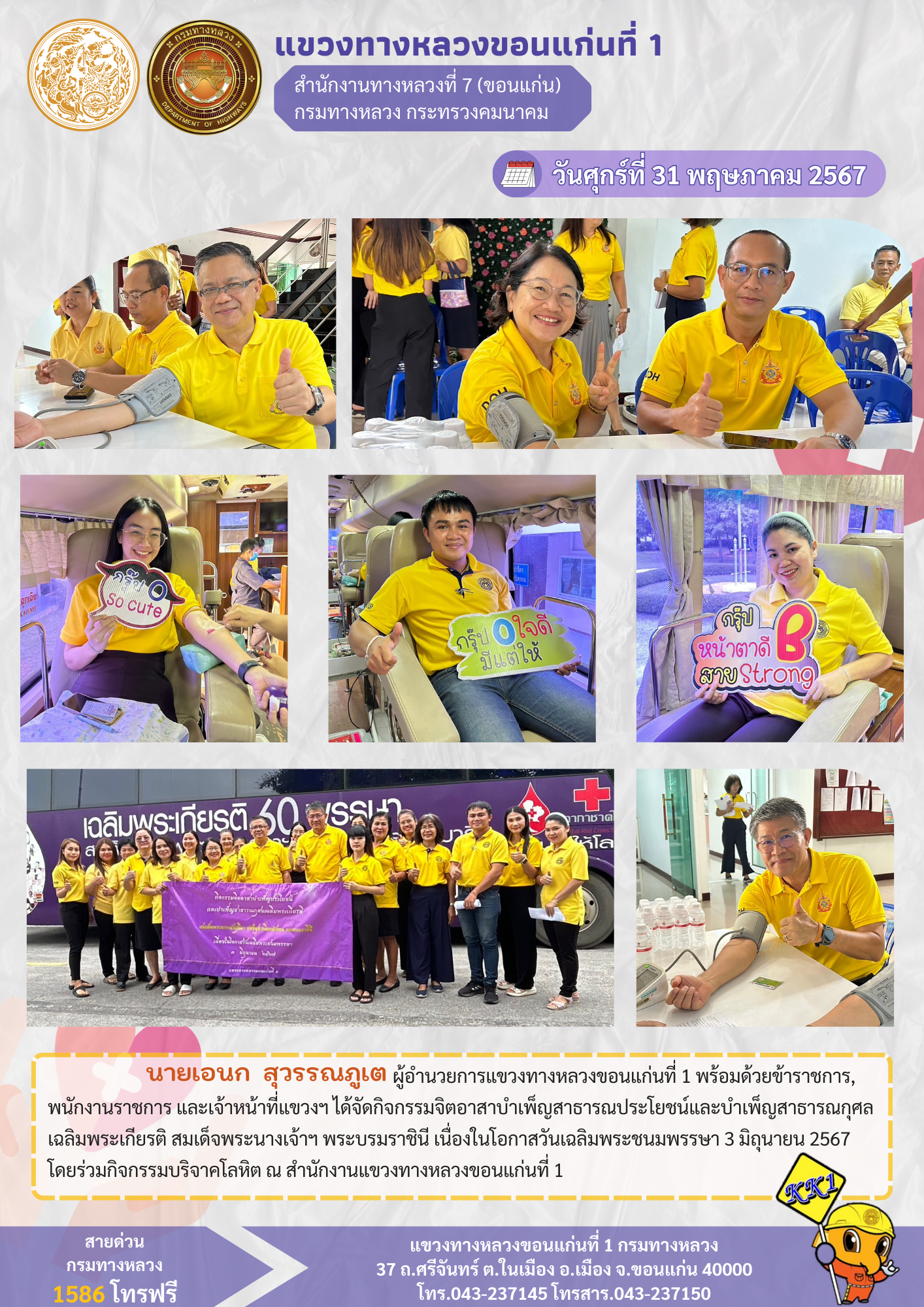 นายเอนก สุวรรณภูเต ผู้อำนวยการแขวงทางหลวงขอนแก่นที่ 1 พร้อมด้วยข้าราชการ, พนักงานราชการ และเจ้าหน้าที่แขวงฯ ได้จัดกิจกรรมจิตอาสาบำเพ็ญสาธารณประโยชน์และบำเพ็ญสาธารณกุศลเฉลิมพระเกียรติ สมเด็จพระนางเจ้าฯ พระบรมราชินี เนื่องในโอกาสวันเฉลิมพระชนมพรรษา 3 มิถุนายน 2567 โดยร่วมกิจกรรมบริจาคโลหิต ณ สำนักงานแขวงทางหลวงขอนแก่นที่ 1