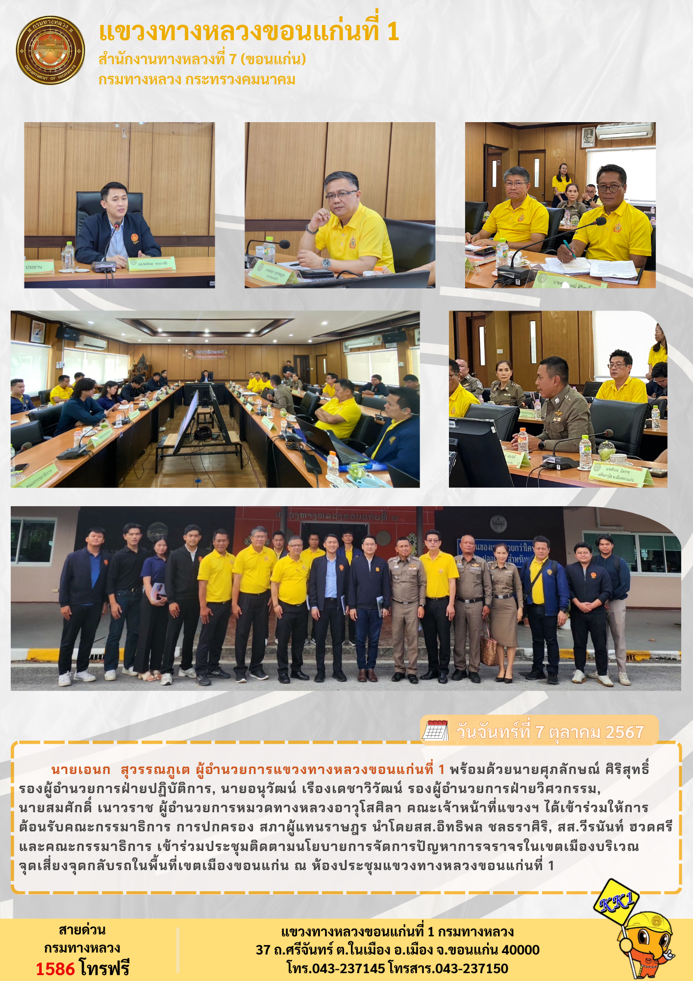 วันที่ 7 ตุลาคม 2567  เวลา 14:00 น. นายเอนก สุวรรณภูเต ผู้อำนวยการแขวงทางหลวงขอนแก่นที่ 1 นายอนุวัฒน์ เรืองเดชาวิวัฒน์ รองผู้อำนวยการฝ่ายวิศวกรรม นายศุภลักษณ์ ศิริสุทธิ์ รองผู้อำนวยการฝ่ายปฏิบัติการ นายจักรพันธ์ สินโคกสูง นายช่างโยธาชำนาญงาน และนายศราวุธ คีรีวงษ์ วิศวกรโยธาปฎิบัติการ  ร่วมประชุมคณะกรรมาธิการการปกครอง สภาผู้แทนราษฎร ในการติดตามการแก้ไขปัญหาการจราจรเมืองหลักในภูมิภาค โดยมีนายอิทธิพล ชลธราศิริ สมาชิกสภาผู้แทนราษฎรจังหวัดขอนแก่น พรรคประชาชน เป็นประธาน ทั้งนี้ยังมีนายวีรนันท์ ฮวดศรี  สมาชิกสภาผู้แทนราษฎรจังหวัดขอนแก่น พรรคประชาชน พ.ต.ท.วีระชาติ คำเพราะ สว.จร.สภ.เมืองขอนแก่น ร.ต.อ.หญิงเตือนจิตร พชรศิริชัยกุล รอง สว.จร.สภ.เมืองขอนแก่น และคณะกรรมาธิการเข้าร่วมรับฟังด้วย