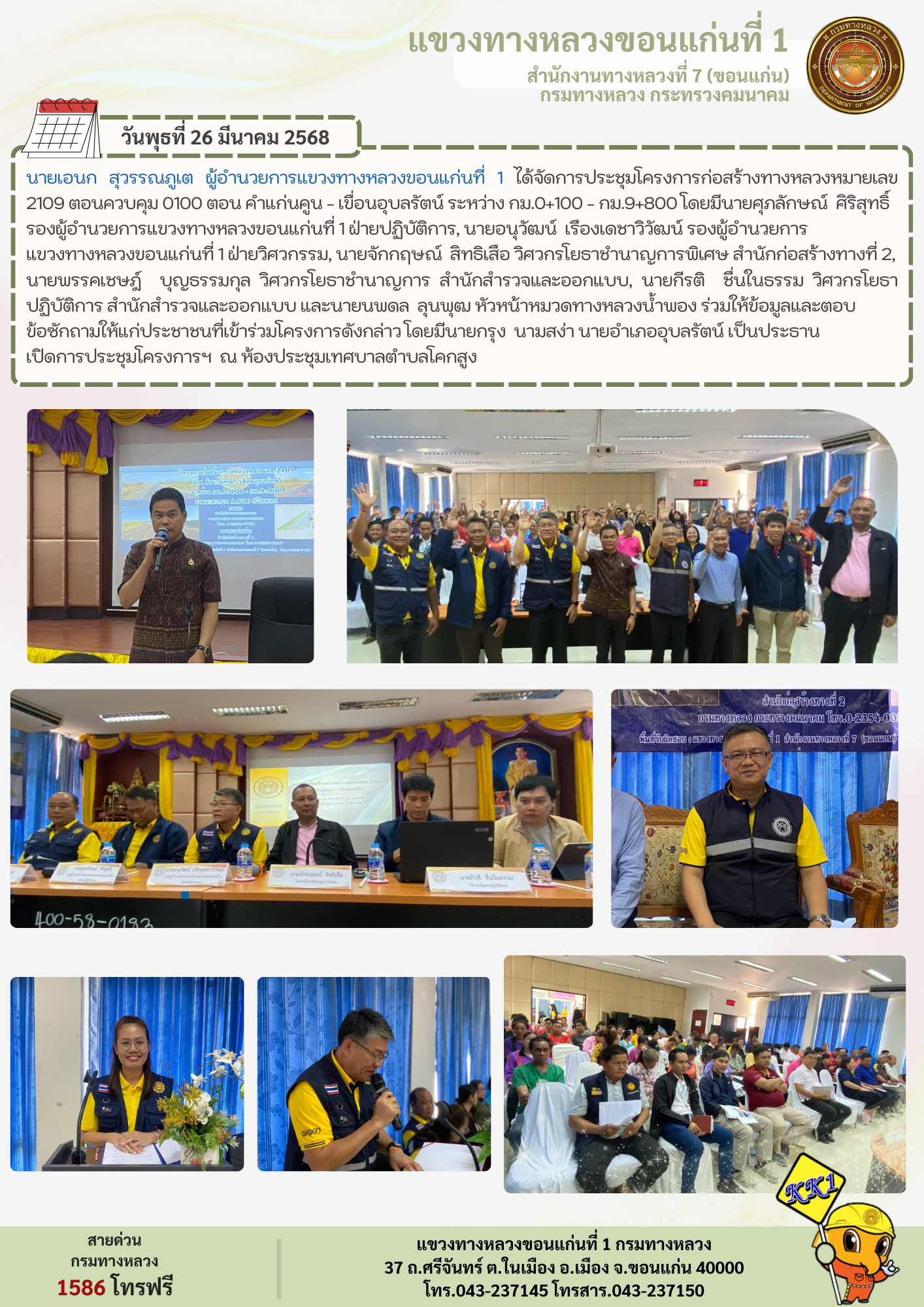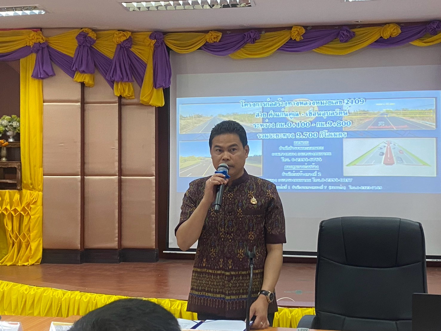 นายเอนก สุวรรณภูเต ผู้อำนวยการแขวงทางหลวงขอนแก่นที่ 1 ได้จัดการประชุมโครงการก่อสร้างทางหลวงหมายเลข 2109 ตอนควบคุม 0100 ตอน คำแก่นคูน - เขื่อนอุบลรัตน์ ระหว่าง กม.0+100 - กม.9+800 โดยมีนายศุภลักษณ์ ศิริสุทธิ์ รองผู้อำนวยการแขวงทางหลวงขอนแก่นที่ 1 ฝ่ายปฏิบัติการ, นายอนุวัฒน์ เรืองเดชาวิวัฒน์ รองผู้อำนวยการแขวงทางหลวงขอนแก่นที่ 1 ฝ่ายวิศวกรรม, นายจักกฤษณ์ สิทธิเสือ วิศวกรโยธาชำนาญการพิเศษ สำนักก่อสร้างทางที่ 2, นายพรรคเชษฎ์ บุญธรรมกุล วิศวกรโยธาชำนาญการ สำนักสำรวจและออกแบบ, นายกีรติ ชื่นในธรรม วิศวกรโยธาปฏิบัติการ สำนักสำรวจและออกแบบ และนายนพดล ลุนพุฒ หัวหน้าหมวดทางหลวงน้ำพอง ร่วมให้ข้อมูลและตอบข้อซักถามให้แก่ประชาชนที่เข้าร่วมโครงการดังกล่าว โดยมีนายกรุง นามสง่า นายอำเภออุบลรัตน์ เป็นประธานเปิดการประชุมโครงการฯ ณ ห้องประชุมเทศบาลตำบลโคกสูง
