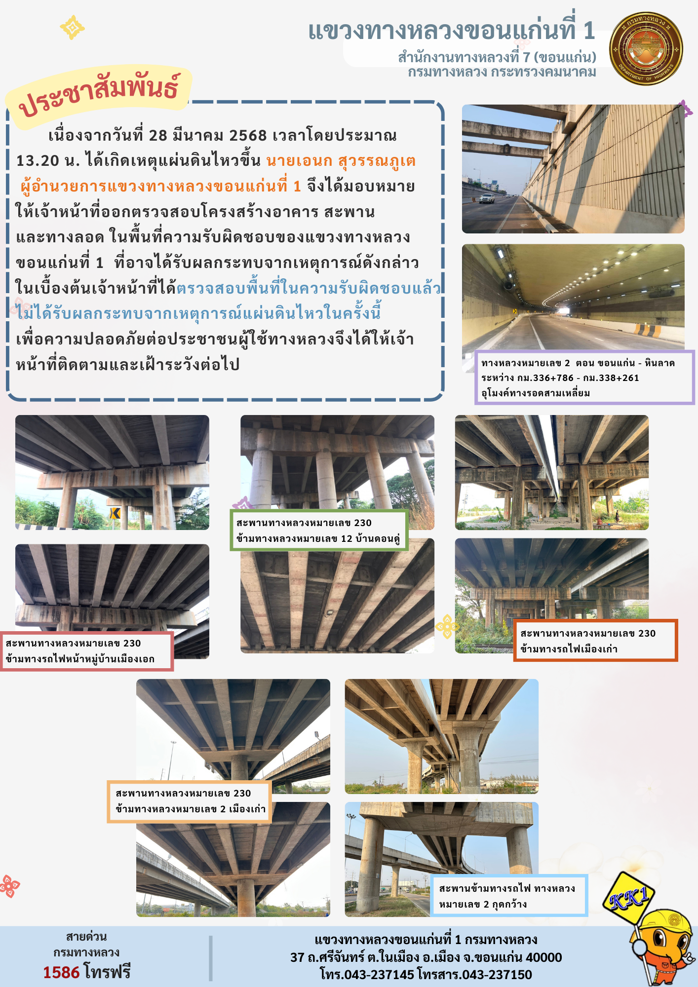เนื่องจากวันที่ 28 มีนาคม 2568 เวลาโดยประมาณ 13.20 น. ได้เกิดเหตุแผ่นดินไหวขึ้น นายเอนก สุวรรณภูเต ผู้อำนวยการแขวงทางหลวงขอนแก่นที่ 1 จึงได้มอบหมายให้เจ้าหน้าที่ออกตรวจสอบโครงสร้างอาคาร สะพาน และทางลอด ในพื้นที่ความรับผิดชอบของแขวงทางหลวงขอนแก่นที่ 1 ที่อาจได้รับผลกระทบจากเหตุการณ์ดังกล่าว