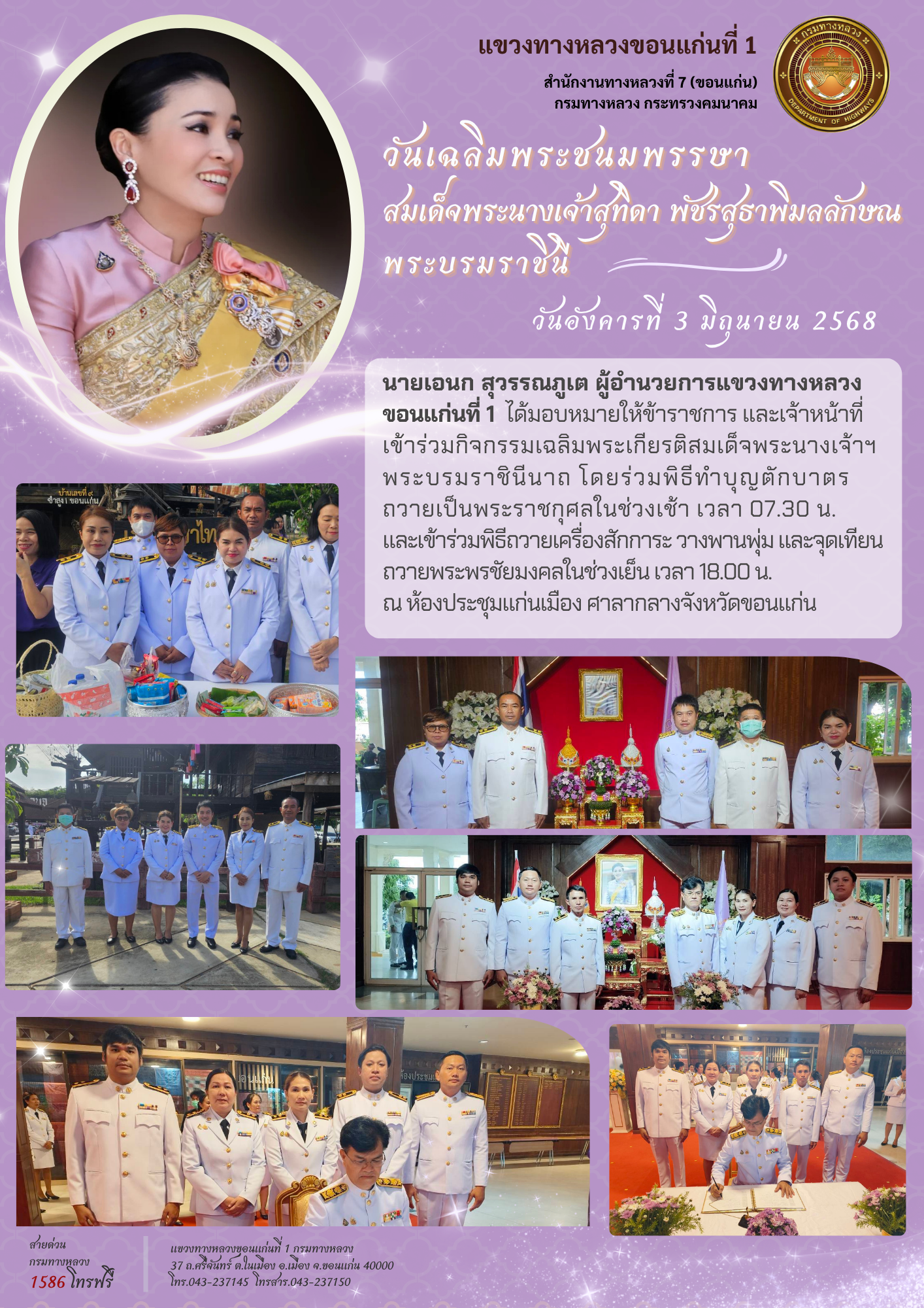 แขวงทางหลวงขอนแก่นที่ 1 เข้าร่วมกิจกรรมเฉลิมพระเกียรติสมเด็จพระนางเจ้าสุทิดา พัชรสุธาพิมลลักษณ พระบรมราชินี เนื่องในโอกาสวันเฉลิมพระชนมพรรษา 3 มิถุนายน 2568
