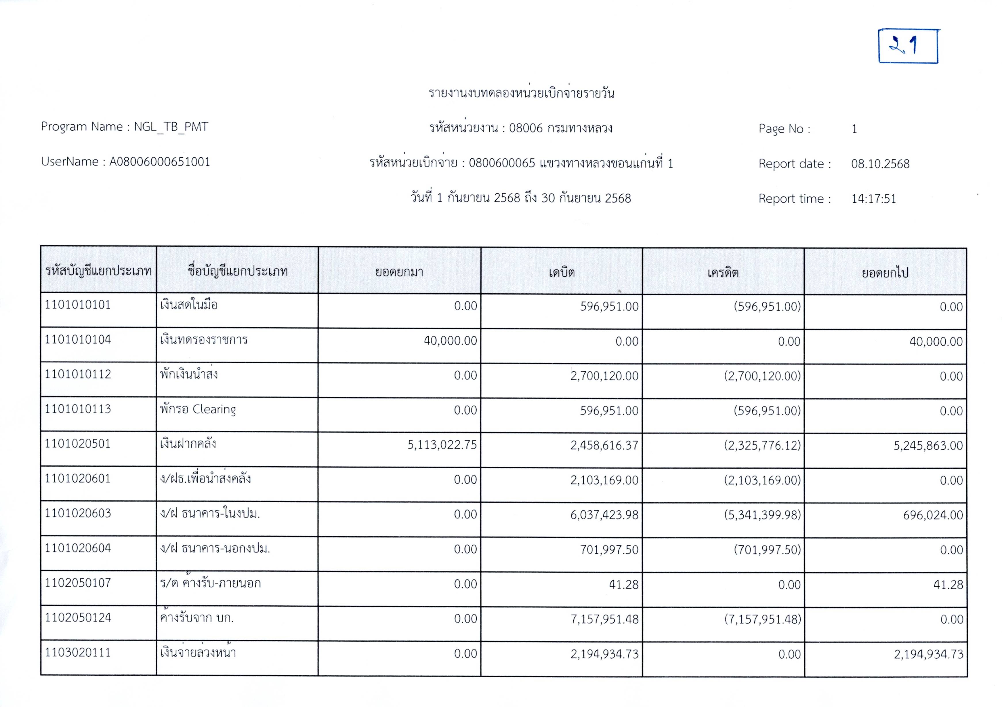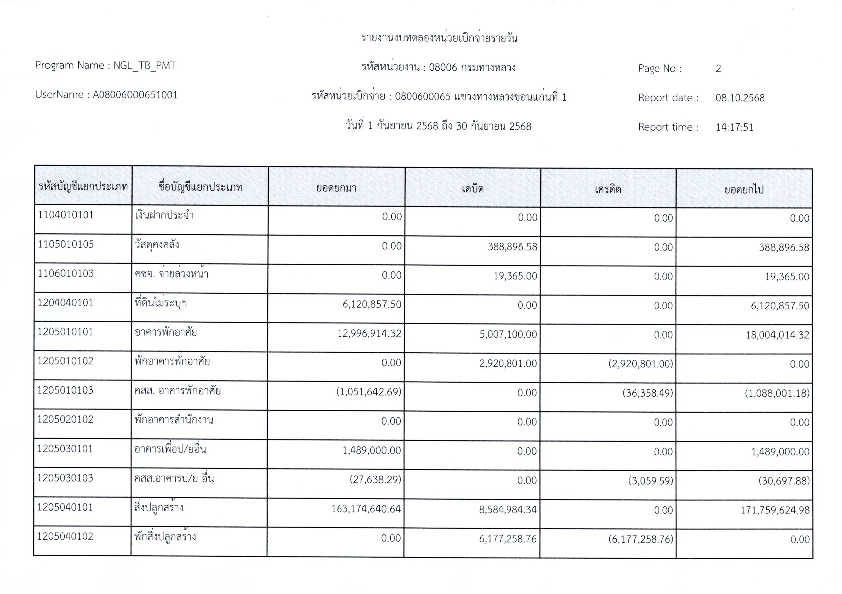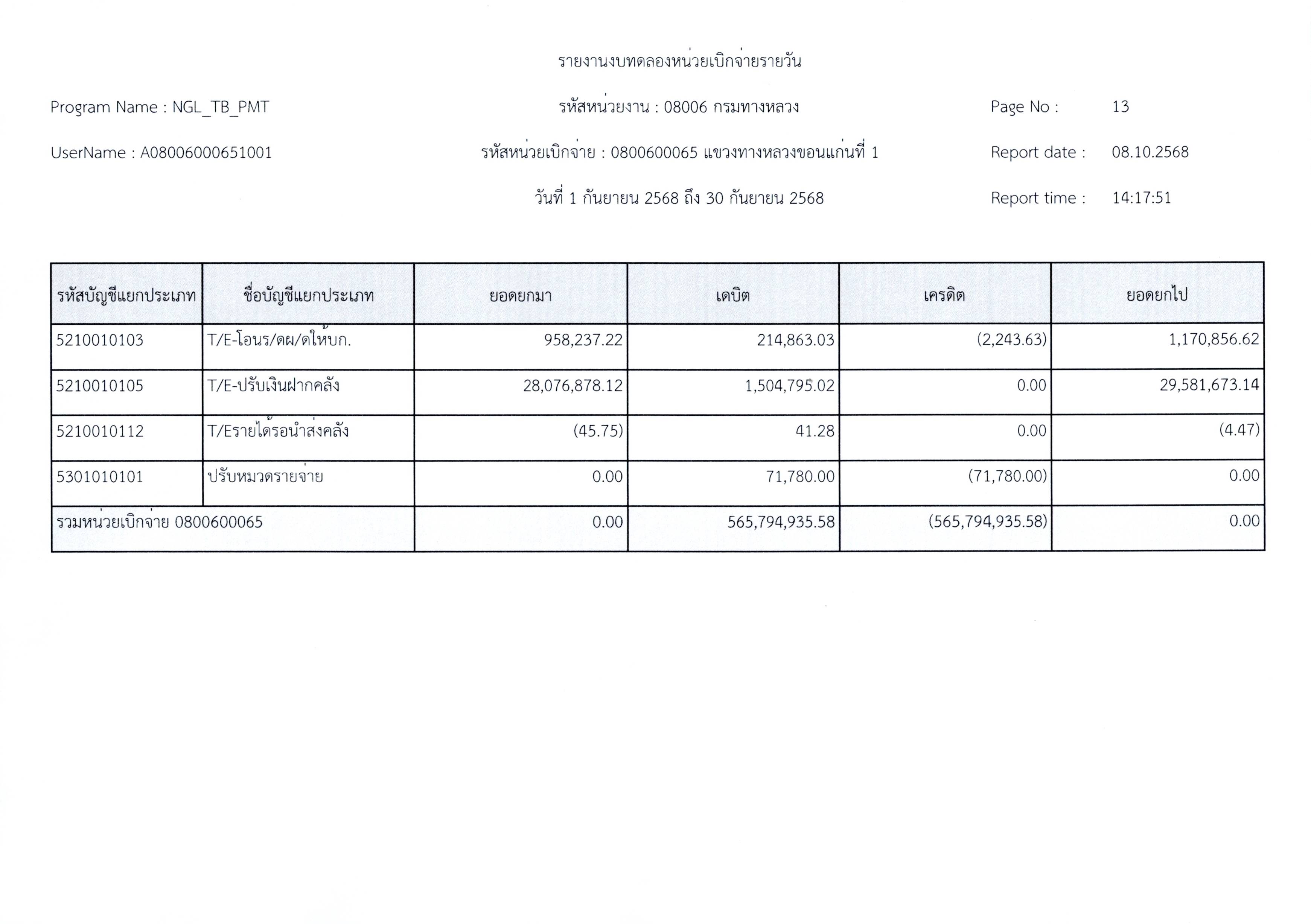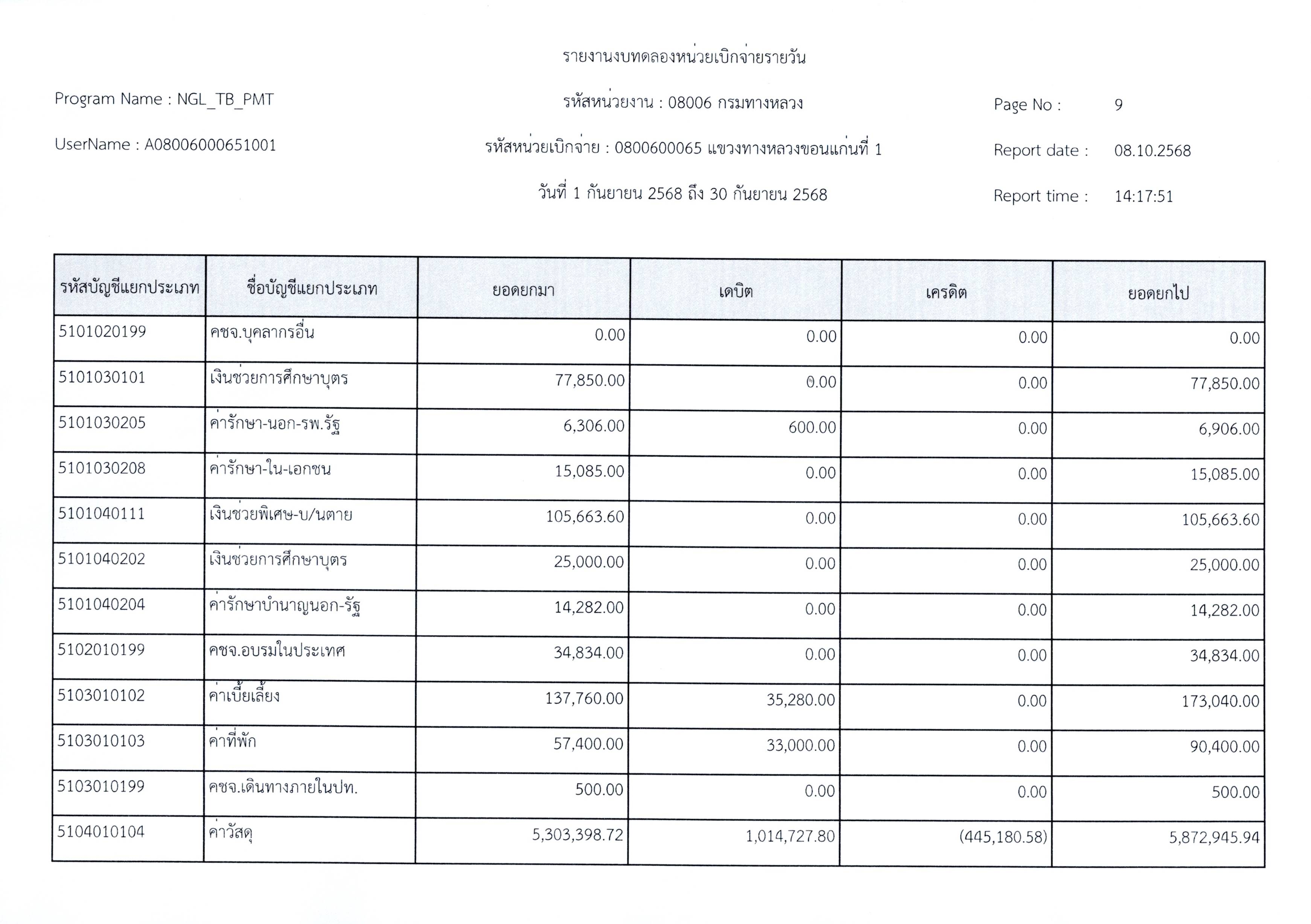งบทดลองประจำเดือนกันยายน 2568 แขวงทางหลวงขอนแก่นที่ 1 กรมทางหลวง