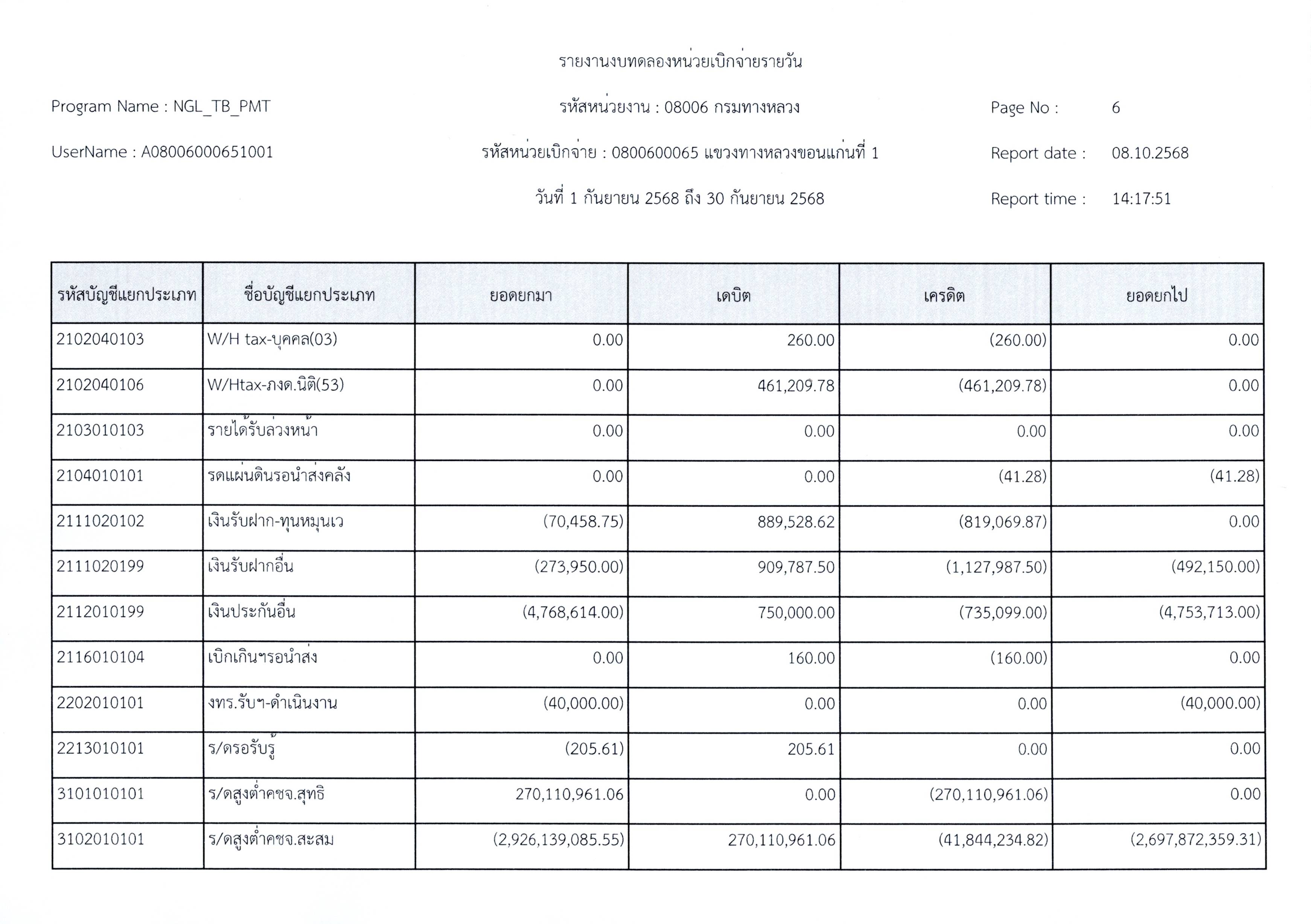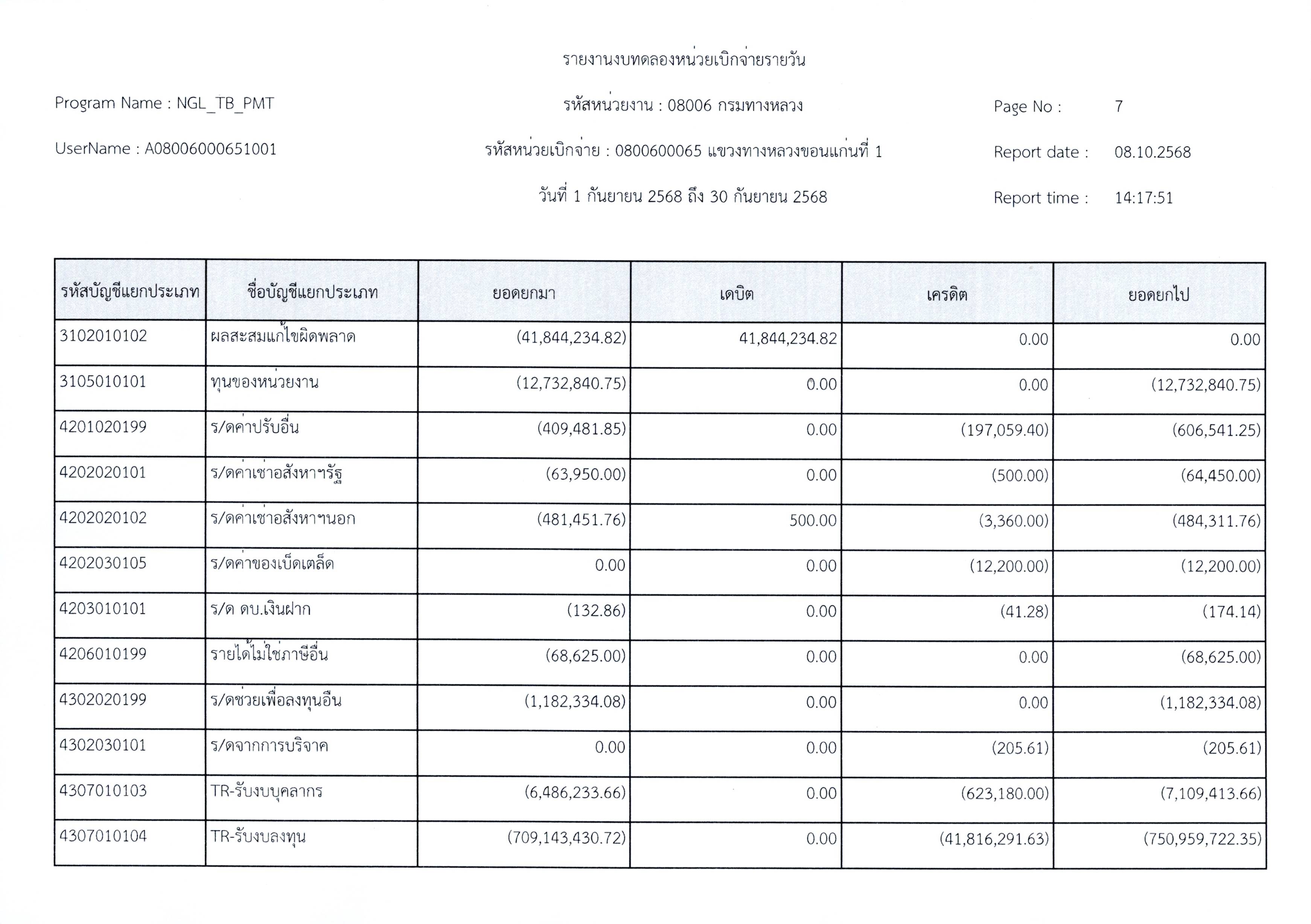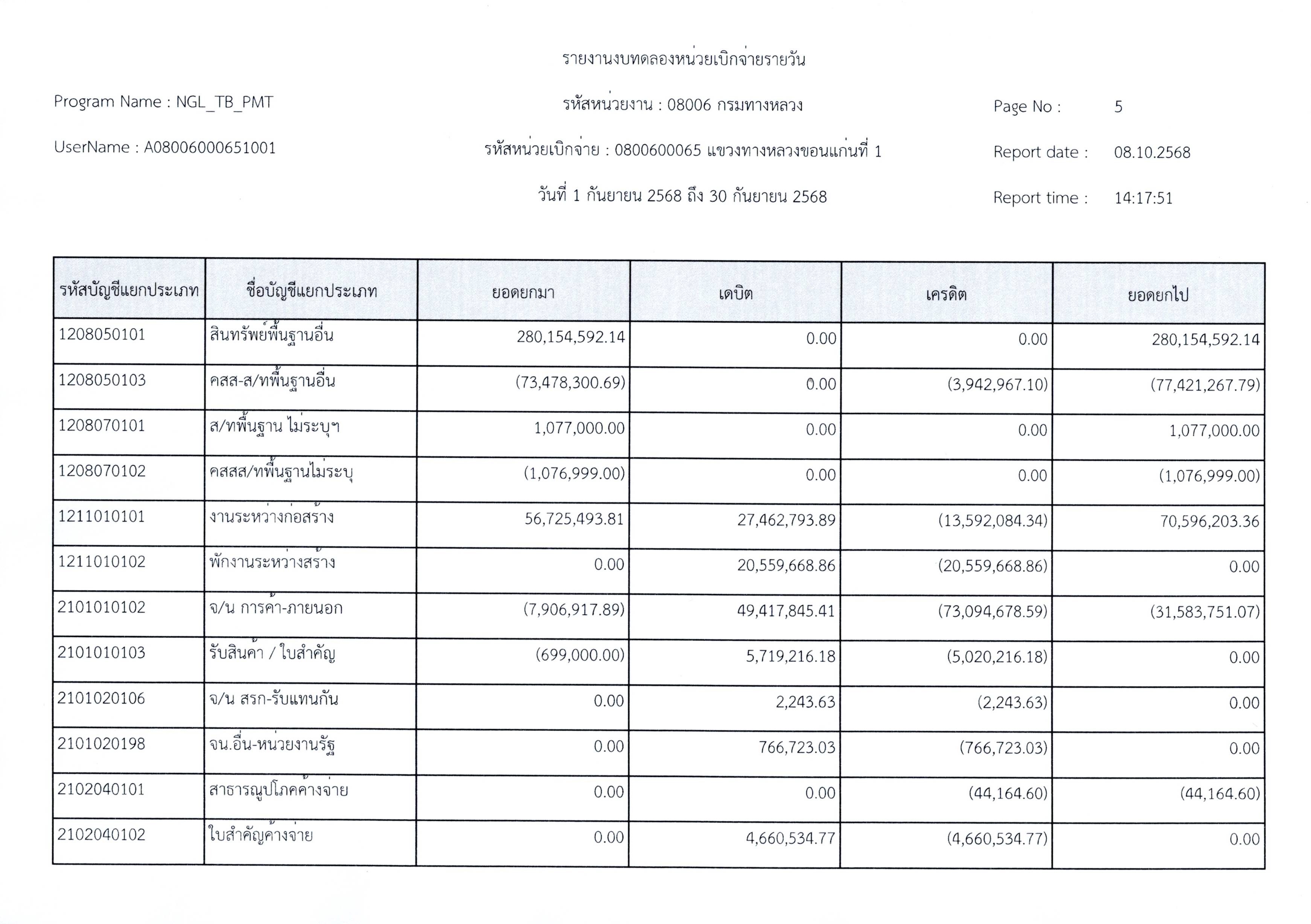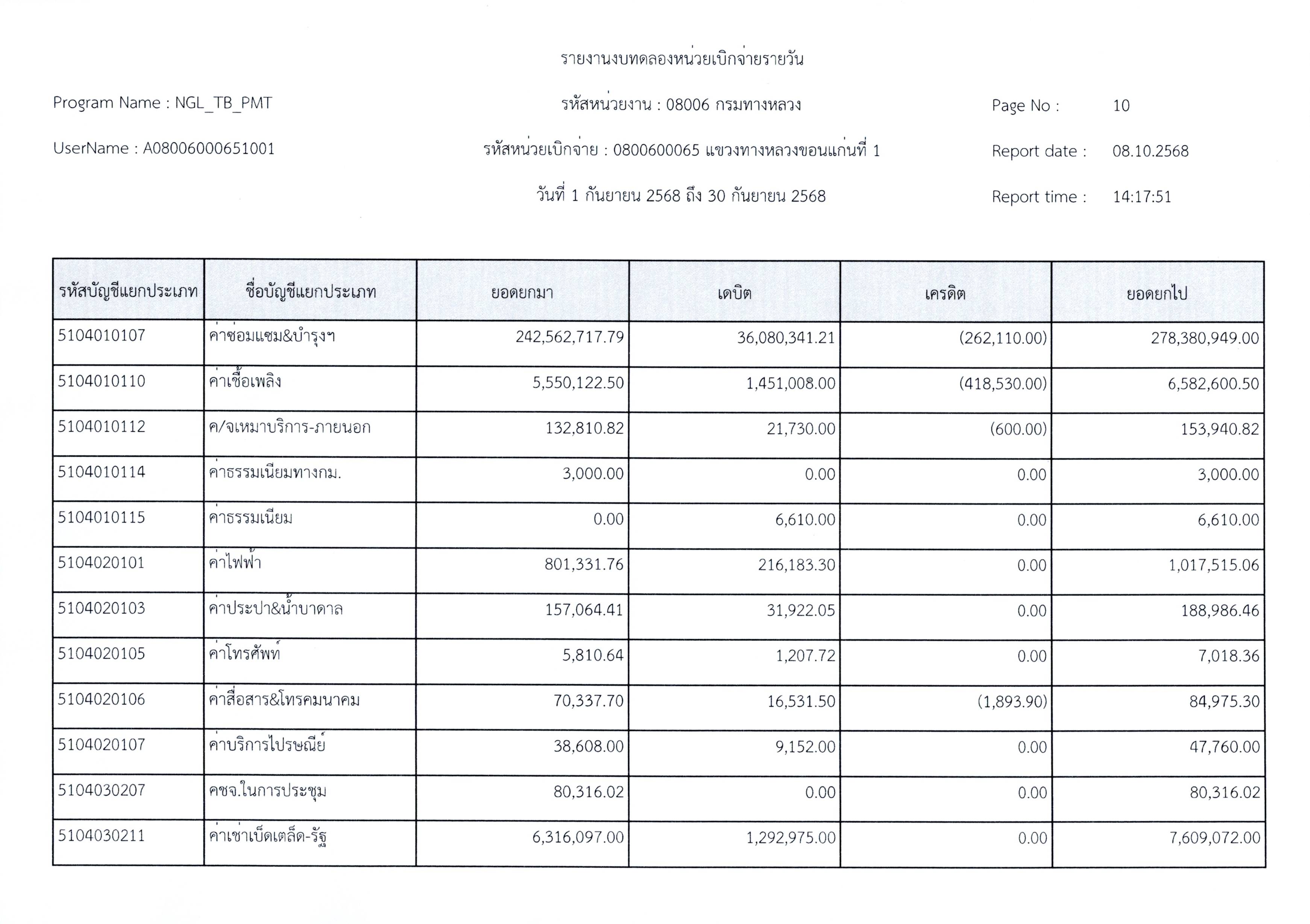 งบทดลองประจำเดือนกันยายน 2568 แขวงทางหลวงขอนแก่นที่ 1 กรมทางหลวง