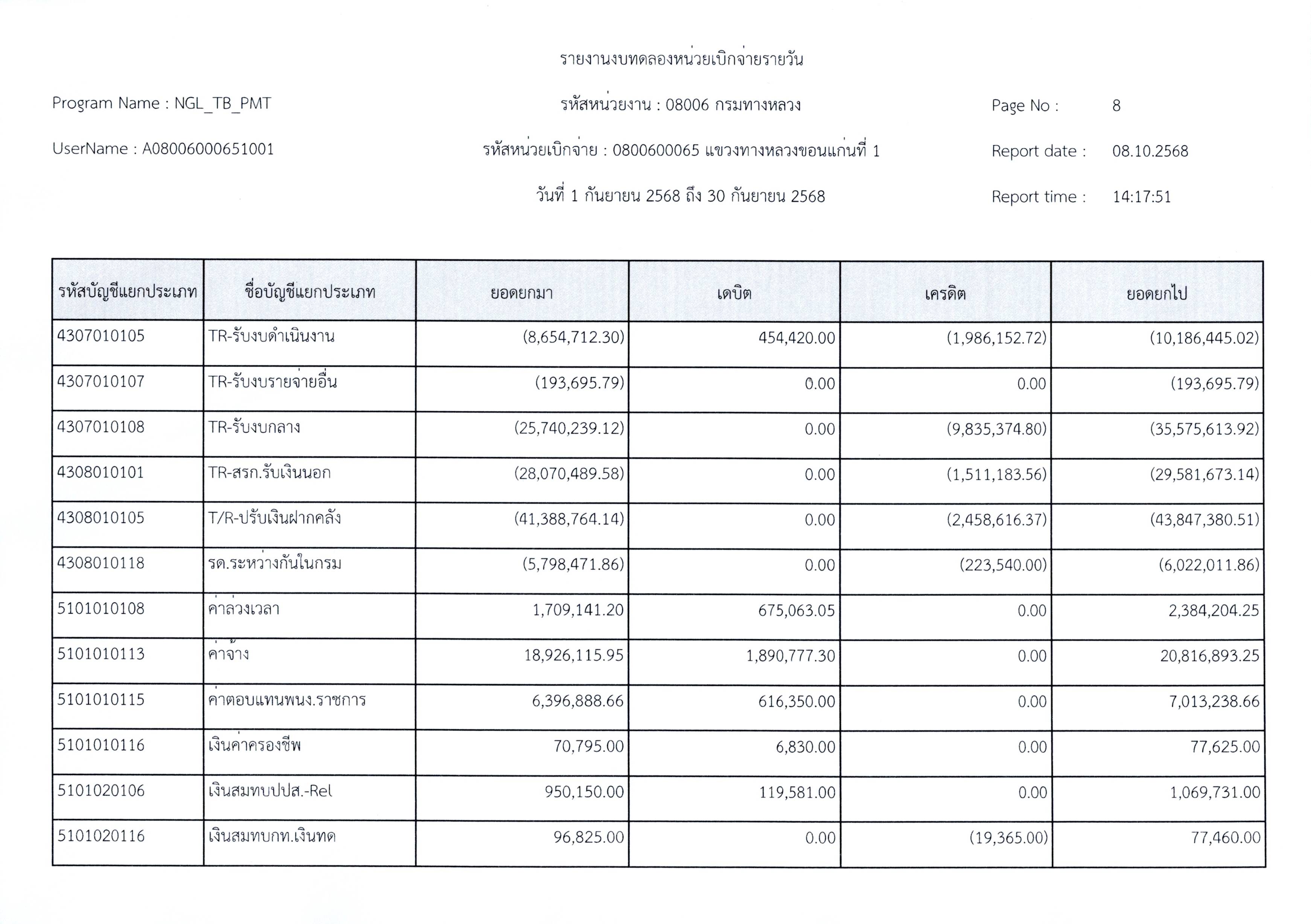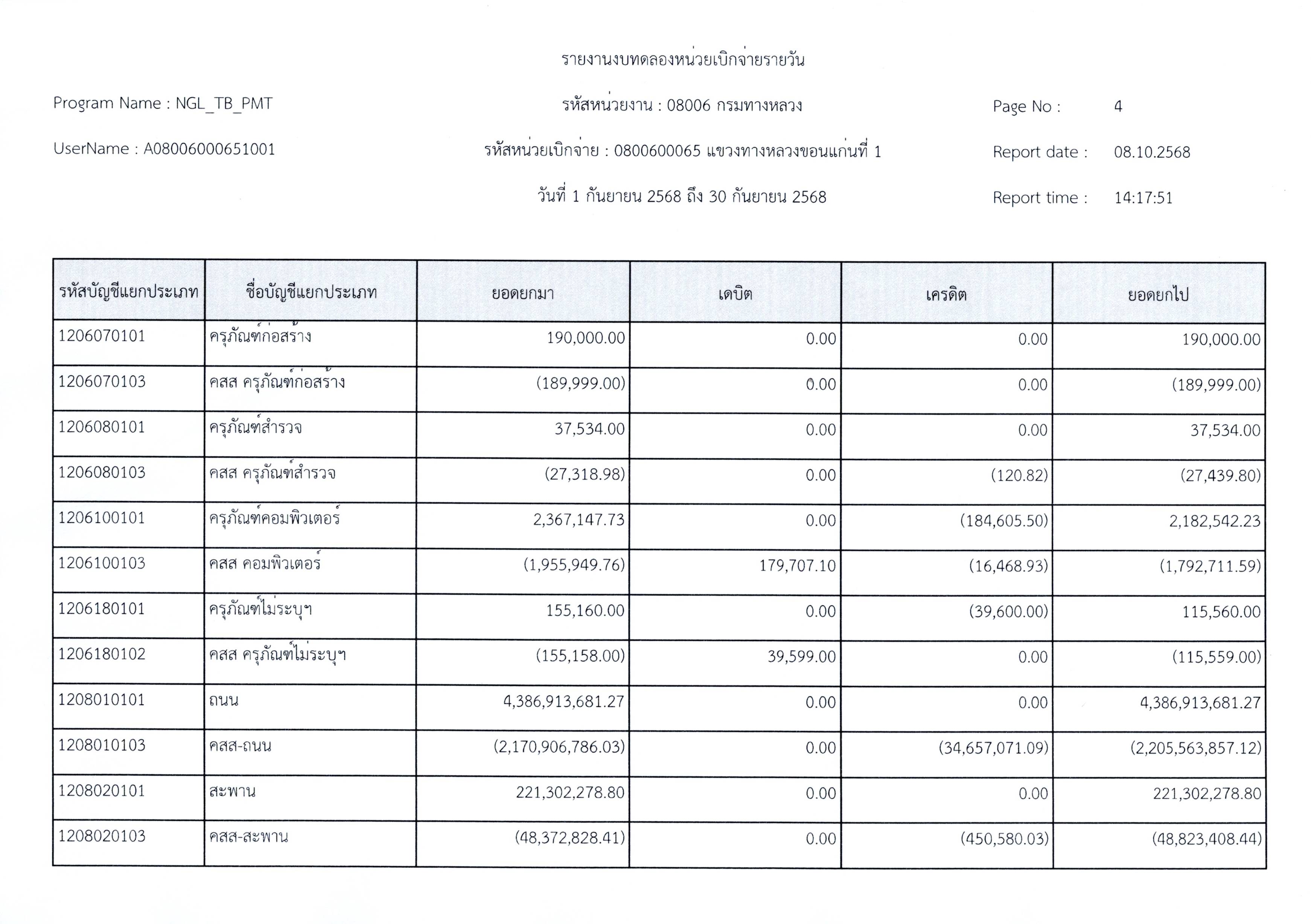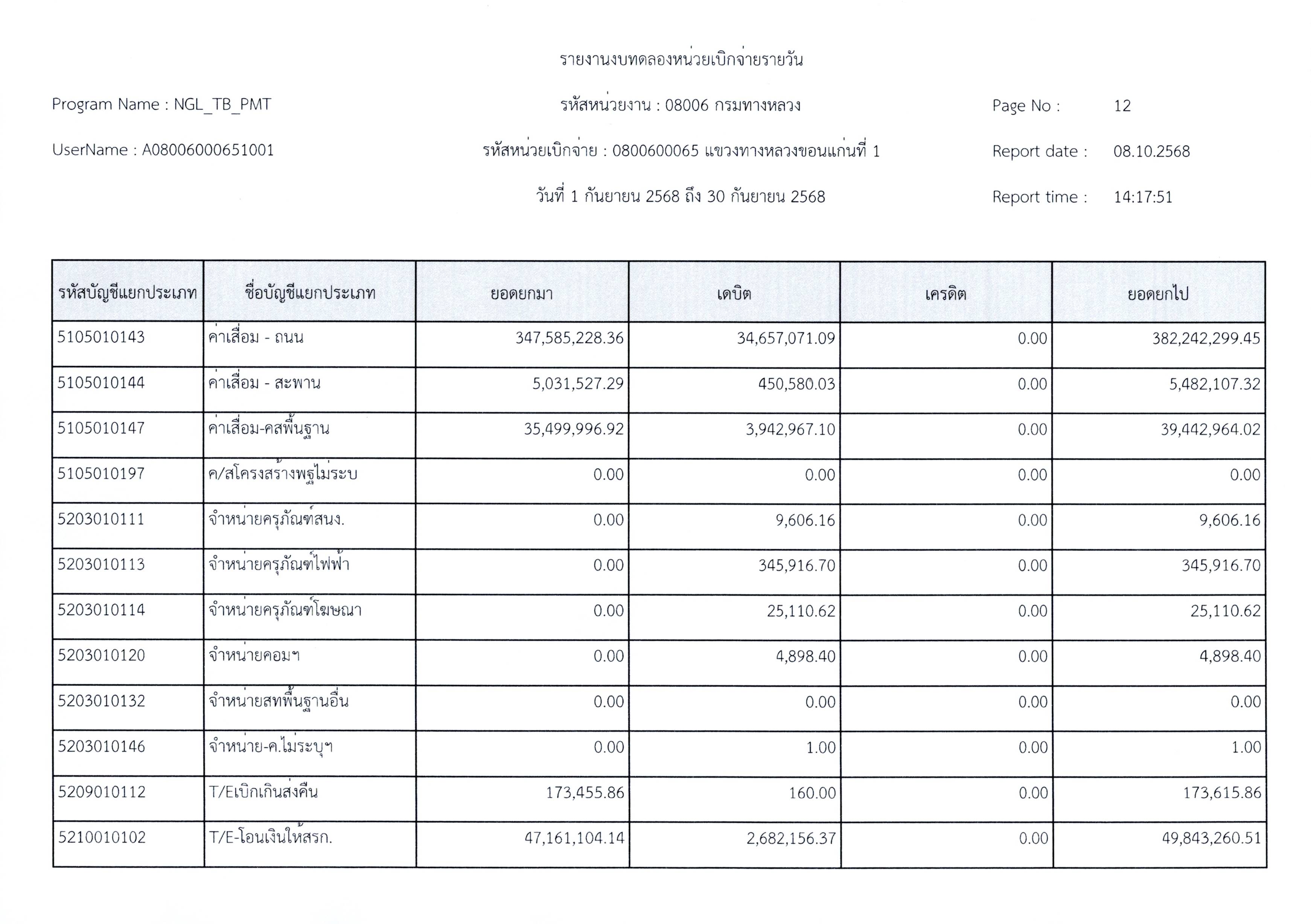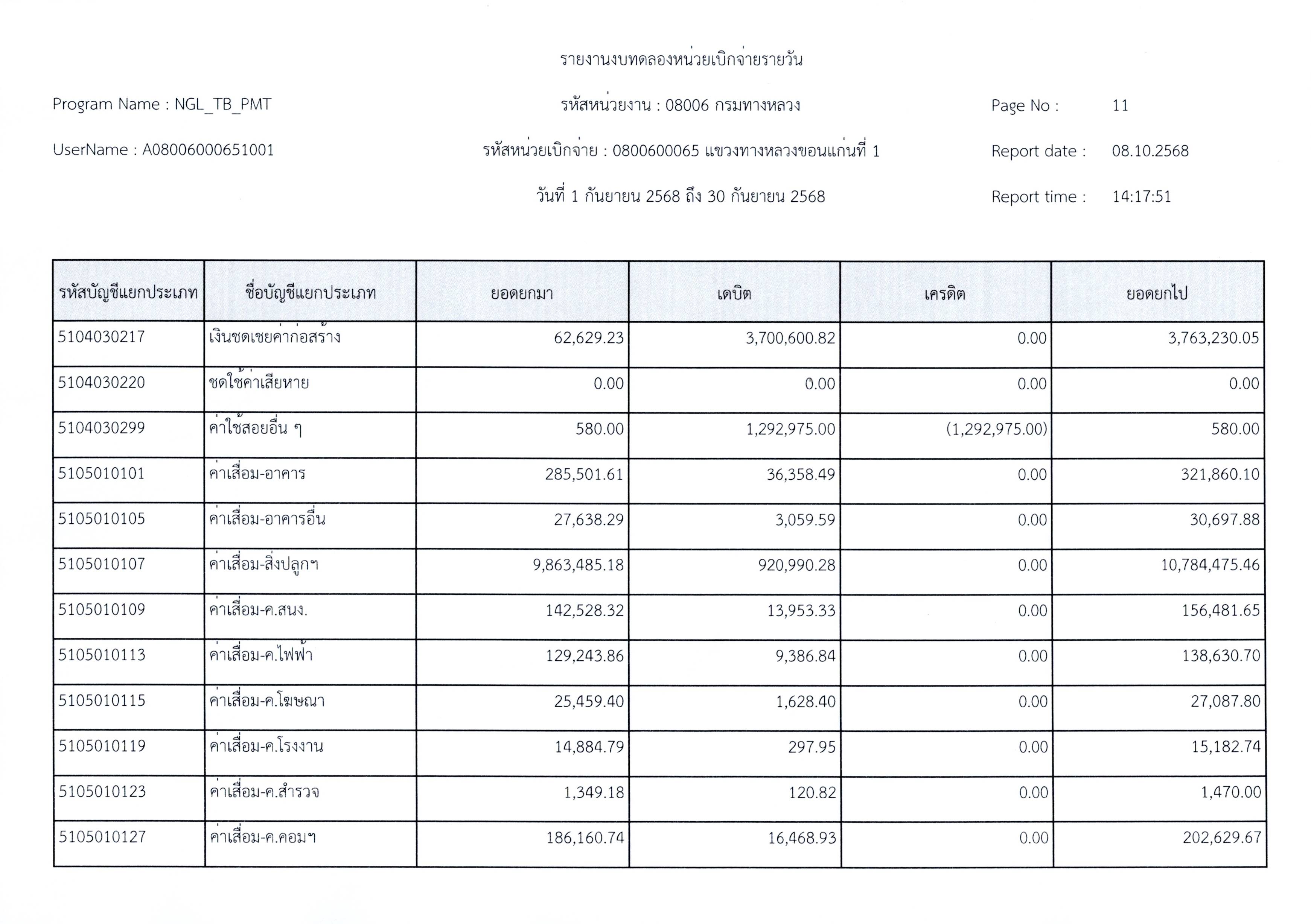 งบทดลองประจำเดือนกันยายน 2568 แขวงทางหลวงขอนแก่นที่ 1 กรมทางหลวง