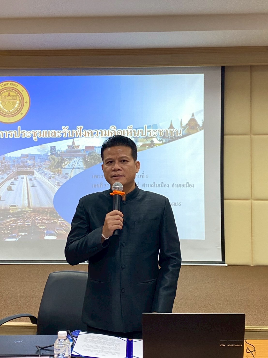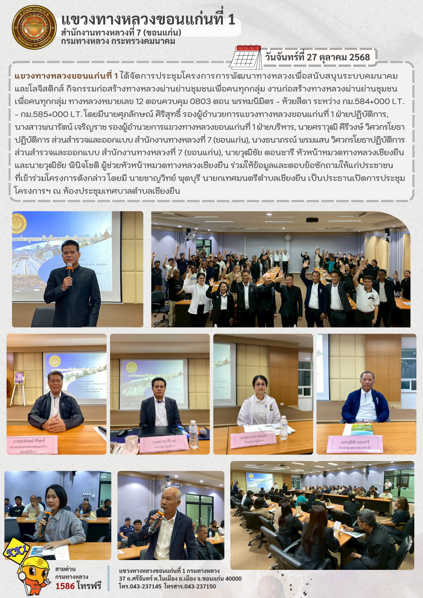 วันจันทร์ที่ 27 ตุลาคม 2568 เวลา 09.00 น. แขวงทางหลวงขอนแก่นที่ 1 ได้จัดการประชุมโครงการการพัฒนาทางหลวงเพื่อสนับสนุนระบบคมนาคมและโลจิสติกส์ กิจกรรมก่อสร้างทางหลวงผ่านย่านชุมชนเพื่อคนทุกกลุ่ม งานก่อสร้างทางหลวงผ่านย่านชุมชนเพื่อคนทุกกลุ่ม ทางหลวงหมายเลข 12 ตอนควบคุม 0803 ตอน พรหมนิมิตร - ห้วยสีดา ระหว่าง กม.584+000 LT. - กม.585+000 LT. โดยมีนายศุภลักษณ์ ศิริสุทธิ์ รองผู้อำนวยการแขวงทางหลวงขอนแก่นที่ 1 ฝ่ายปฏิบัติการ, นางสาวพนารัตน์ เจริญราช รองผู้อำนวยการแขวงทางหลวงขอนแก่นที่ 1 ฝ่ายบริหาร, นายศราวุฒิ คีรีวงษ์ วิศวกรโยธาปฏิบัติการ ส่วนสำรวจและออกแบบ สำนักงานทางหลวงที่ 7 (ขอนแก่น), นางธนาภรณ์ พรมแสน วิศวกรโยธาปฏิบัติการส่วนสำรวจและออกแบบ สำนักงานทางหลวงที่ 7 (ขอนแก่น), นายวุฒิชัย ดอนชารี หัวหน้าหมวดทางหลวงเชียงยืน และนายวุฒิชัย พินิจโชติ ผู้ช่วยหัวหน้าหมวดทางหลวงเชียงยืน ร่วมให้ข้อมูลและตอบข้อซักถามให้แก่ประชาชนที่เข้าร่วมโครงการดังกล่าว โดยมี นายชาญวิทย์ พุดบุรี นายกเทศมนตรีตำบลเชียงยืน เป็นประธานเปิดการประชุมโครงการฯ ณ ห้องประชุมเทศบาลตำบลเชียงยืน
