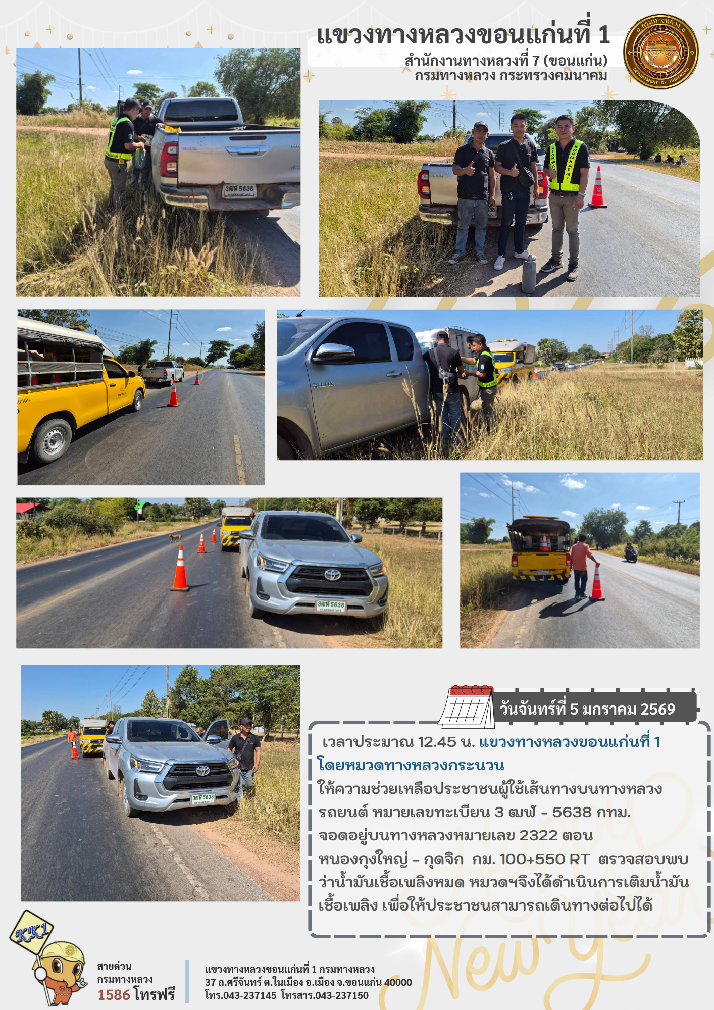 วันจันทร์ที่ 5 มกราคม 2569 เวลาประมาณ 12.45 น. แขวงทางหลวงขอนแก่นที่ 1 โดยหมวดทางหลวงกระนวน ให้ความช่วยเหลือประชาชนผู้ใช้เส้นทางบนทางหลวง รถยนต์ หมายเลขทะเบียน 3 ฒฬ - 5638 กทม. จอดอยู่บนทางหลวงหมายเลข 2322 ตอน หนองกุงใหญ่ - กุดจิก กม. 100+550 RT ตรวจสอบพบว่าน้ำมันเชื้อเพลิงหมด หมวดฯจึงได้ดำเนินการเติมน้ำมันเชื้อเพลิง เพื่อให้ประชาชนสามารถเดินทางต่อไปได้