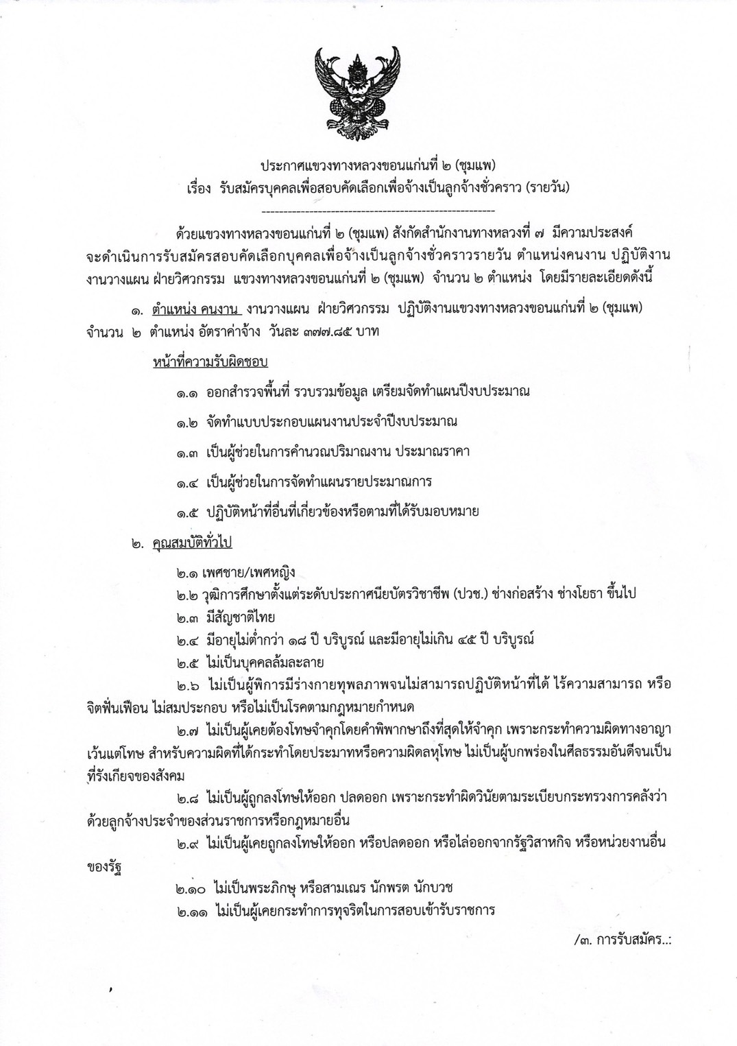 ข้อมูลประกาศรับสมัครพนักงานราชการ : รับสมัครคัดเลือกบุคคลเพื่อจ้างเป็นลูกจ้างชั่วคราวรายวัน ตำแหน่งคนงาน ปฏิบัติงาน งานวางแผน ฝ่ายวิศวกรรม จำนวน 2 ตำแหน่ง