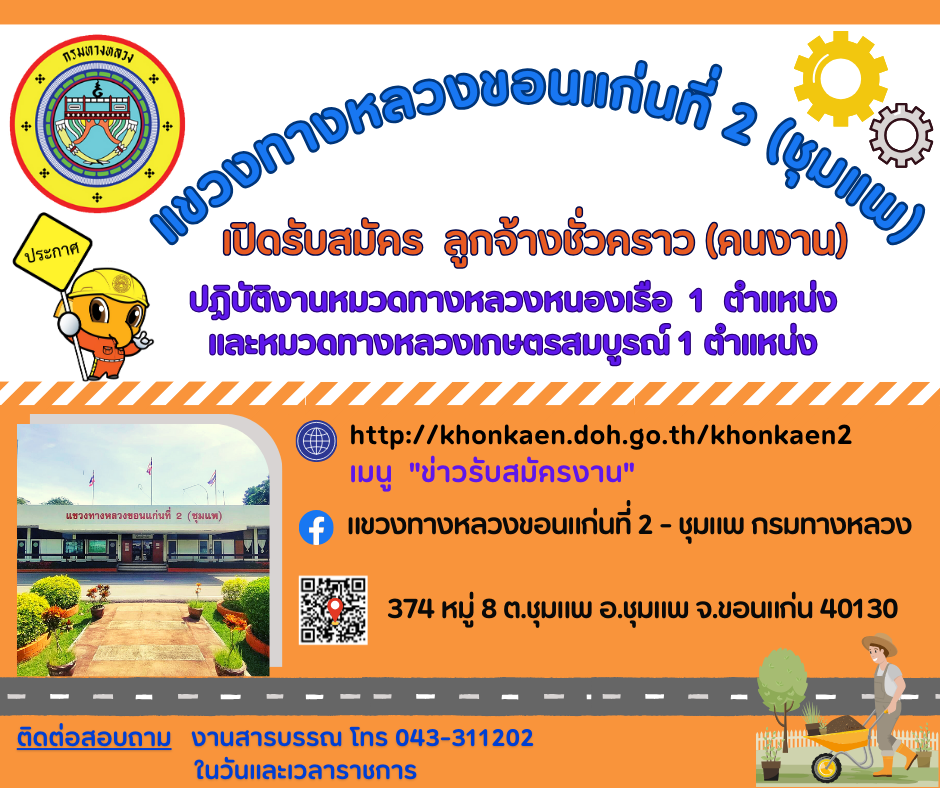 ด้วยแขวงทางหลวงขอนแก่นที่ ๒ (ชุมแพ) สังกัดสำนักงานทางหลวงที่ ๗ มีความประสงค์จะดำเนินการรับสมัครสอบคัดเลือกบุคคลเพื่อจ้างเป็นลูกจ้างชั่วคราวรายวัน ตำแหน่งคนงาน