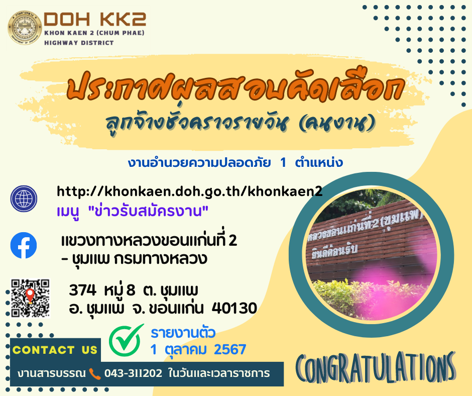 ตามที่แขวงทางหลวงขอนแก่นที่ ๒ (ชุมแพ) ได้ดำเนินการรับสมัครคัดเลือกลูกจ้างชั่วคราวรายวันตามประกาศที่รับสมัคร ลงวันที่ 16 กันยายน 2567 จำนวน 1 อัตรา ปฏิบัติงานงานอำนวยความปลอดภัย แขวงทางหลวงขอนแก่นที่ ๒ (ชุมแพ) นั้น บัดนี้ คณะกรรมการได้ดำเนินการประเมินสอบคัดเลือกเสร็จสิ้นแล้ว ในวันที่ 26 กันยายน 2567 จึงประกาศรายชื่อผู้ผ่านการคัดเลือกลูกจ้างชั่วคราวรายวัน ตามรายชื่อดังนี้ ทั้งนี้ บัญชีรายชื่อผู้สอบแข่งขันได้ใช้ได้ไม่เกิน 1 ปี นับตั้งแต่วันขึ้นบัญชี แต่ถ้ามีการแข่งขันใน ตำแหน่งเดียวกันนี้อีกและได้ขึ้นบัญชีผู้สอบแข่งขันได้ใหม่แล้ว บัญชีผู้สอบแข่งขันได้ครั้งนี้เป็นอันยกเลิก รายละเอียดตามเอกสารแนบ