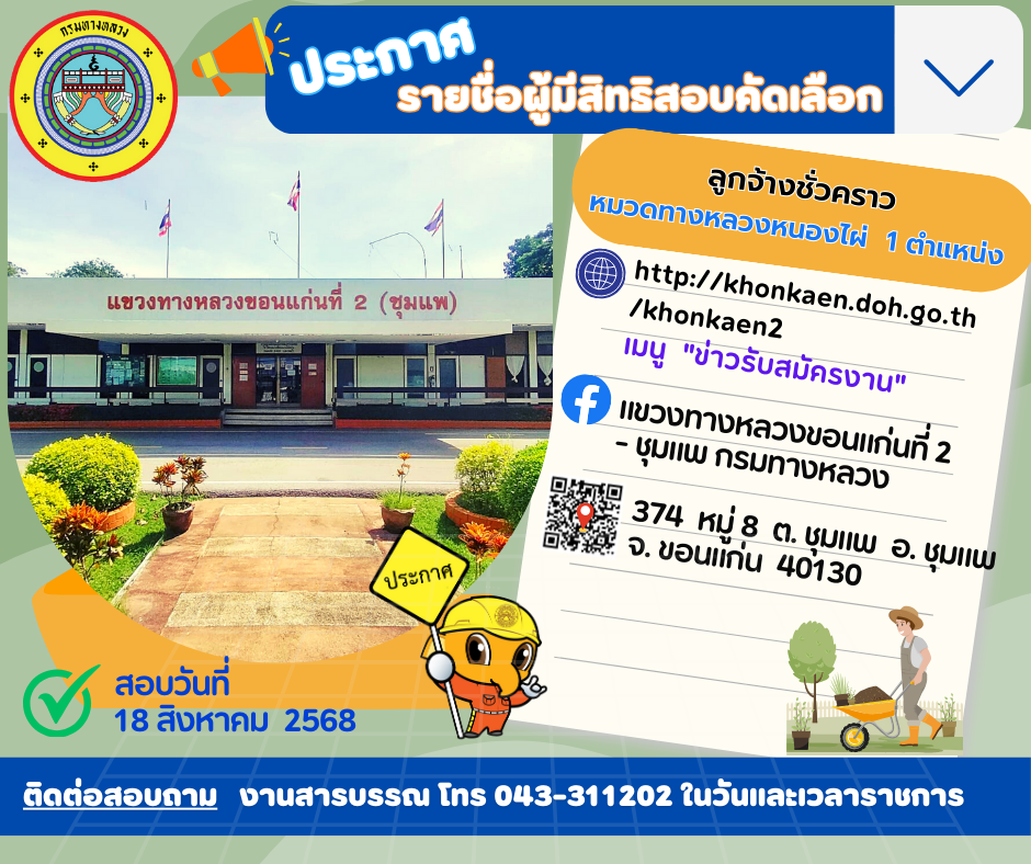 ตามประกาศ แขวงทางหลวงขอนแก่นที่ 2 (ชุมแพ) ลงวันที่ 4 สิงหาคม พ.ศ. 2568 ได้ประกาศรับสมัครลูกจ้างชั่วคราวรายวันคนงานเพื่อปฏิบัติงาน หมวดทางหลวงหนองไผ่ แขวงทางหลวงขอนแก่นที่ 2 (ชุมแพ) โดยเริ่มสมัครตั้งแต่ วันที่ 4 สิงหาคม พ.ศ.2568 ถึงวันที่ 14 สิงหาคม พ.ศ.2568