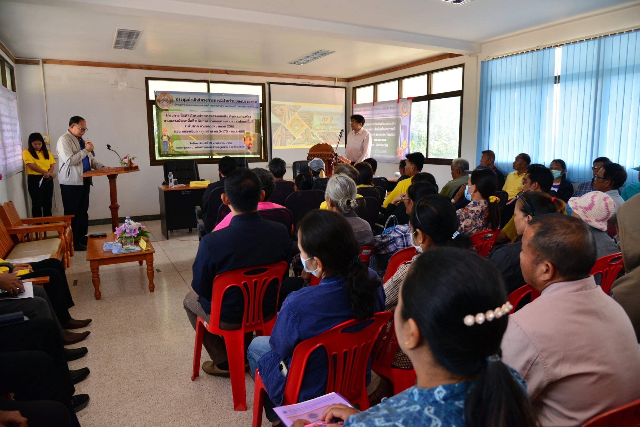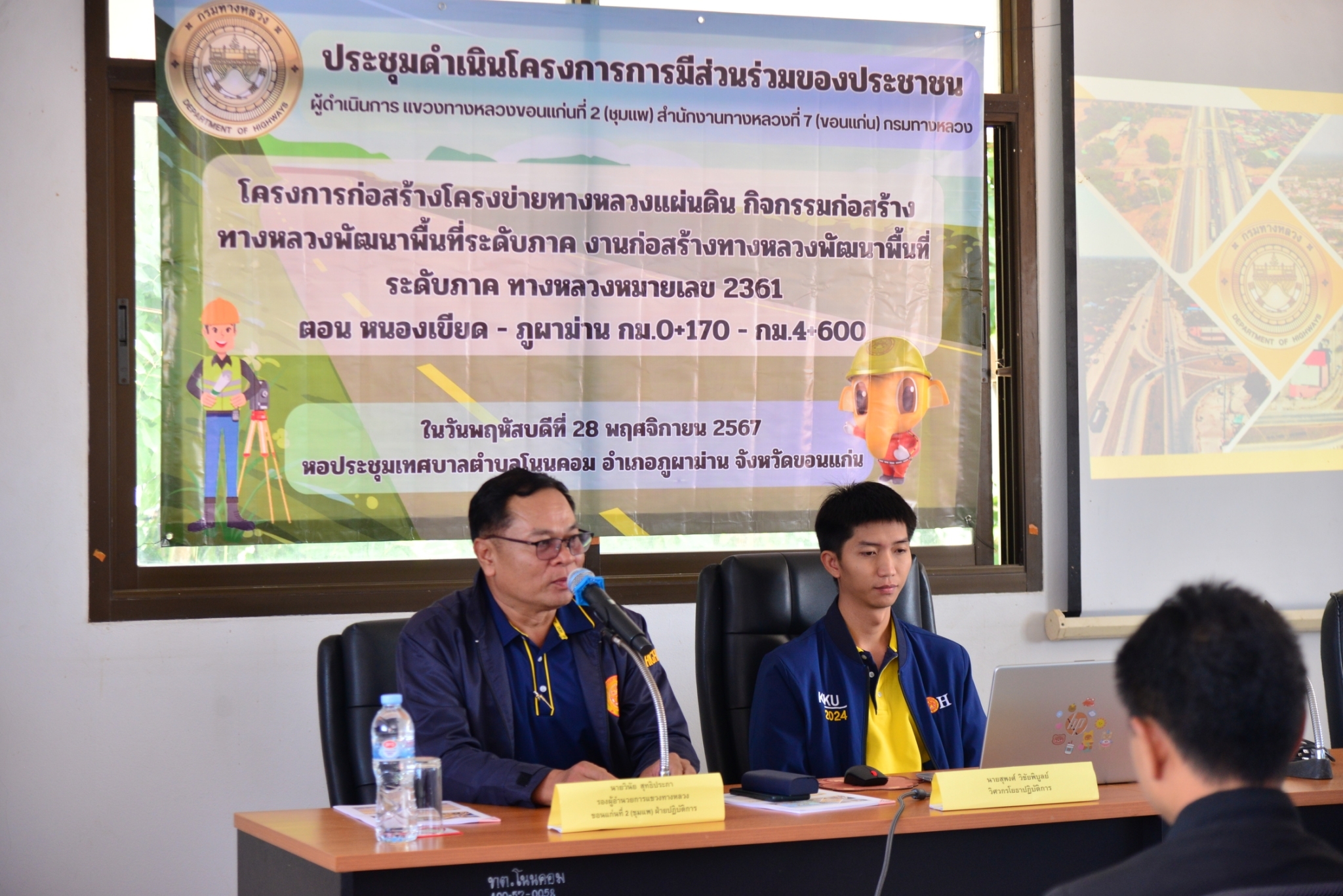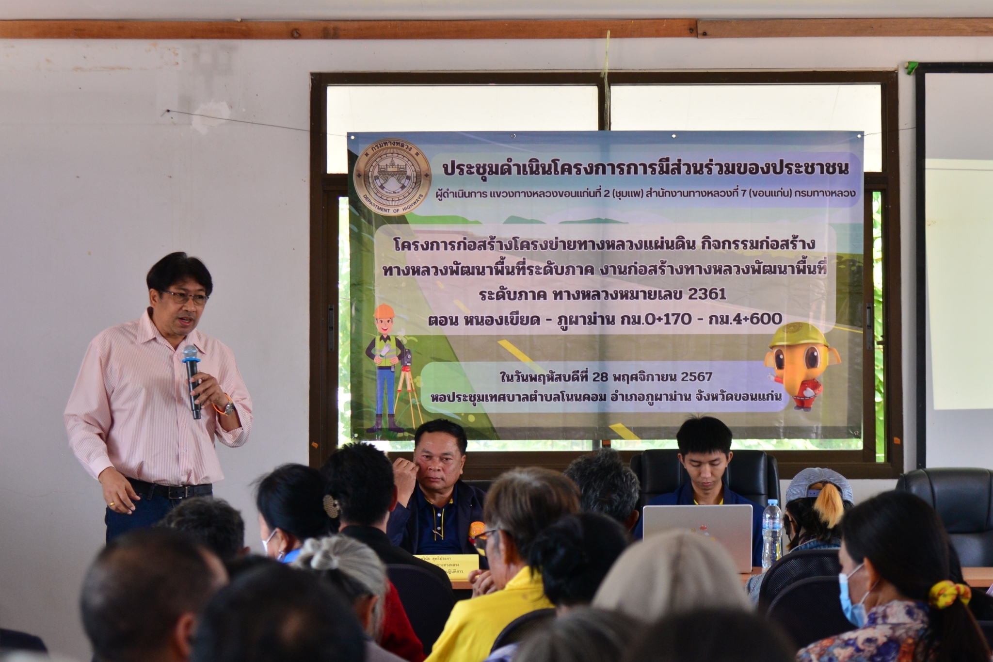 วันที่ 28  พฤศจิกายน 2567 นายประสพชัย ปรางค์ทอง ผู้อำนวยการแขวงทางหลวงขอนแก่นที่ 2 (ชุมแพ) และเจ้าหน้าที่แขวงทางหลวงขอนแก่นที่ 2 (ชุมแพ) ได้ประชุมดำเนินโครงการมีส่วนร่วมของประชาชน ประจำปีงบประมาณ 2568 ร่วมกับหน่วยงานที่เกี่ยวข้องทั้งภาครัฐ ผู้นำท้องถิ่น ผู้นำชุมชน และประชาชนในพื้นที่โครงการ “โครงการก่อสร้างโครงข่ายทางหลวงแผ่นดิน กิจกรรมก่อสร้างทางหลวงพัฒนาพื้นที่ระดับภาค งานก่อสร้างทางหลวงพัฒนาพื้นที่ระดับภาค ทางหลวงหมายเลข 2361 ตอนหนองเขียด - ภูผาม่าน กม.0+170 - กม.4+600“ นายวินัย สุทธิประภา รองผู้อำนวยการแขวงทางหลวงฝ่ายปฏิบัติการ และนายสุพงศ์ วิชัยพิบูลย์ วิศวกรโยธาปฏิบัติการ เป็นวิทยากรนำเสนอรายละเอียดรูปแบบของโครงการ ตลอดจนเปิดโอกาสให้ประชาชนได้ร่วมแสดงความคิดเห็น ข้อเสนอแนะต่างๆ อันจะเป็นประโยชน์ต่อการดำเนินโครงการ ซึ่งในที่ประชุมมีมติเห็นด้วยกับโครงการก่อสร้างดังกล่าว