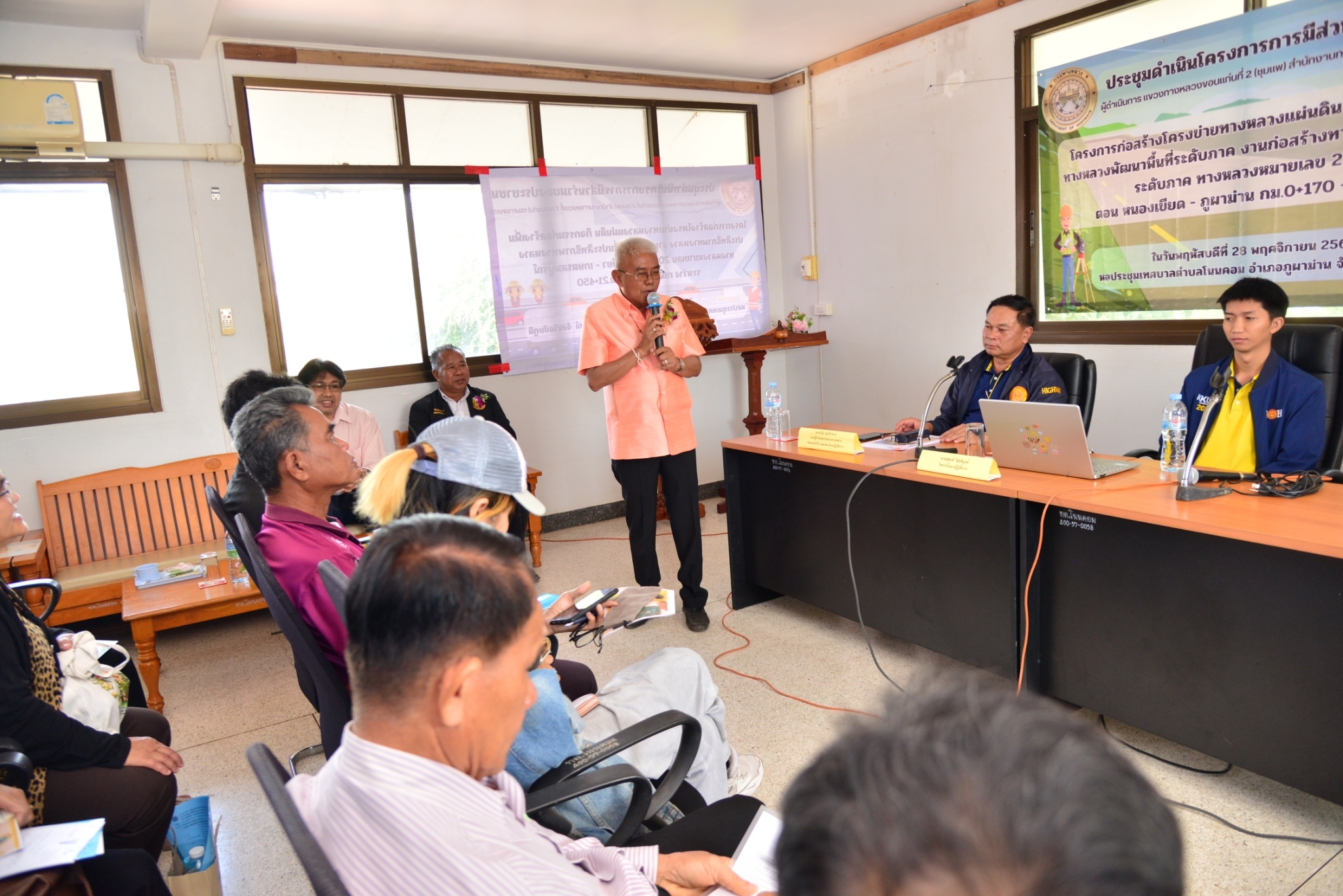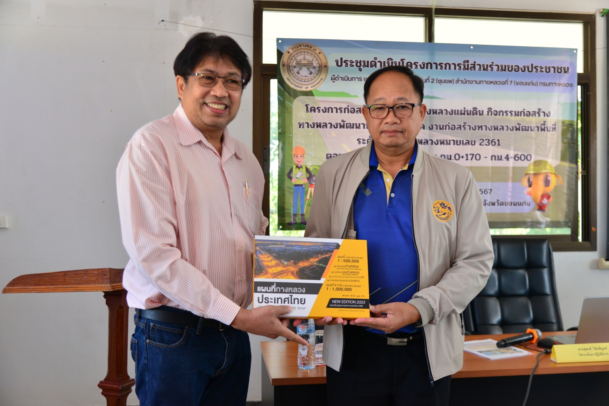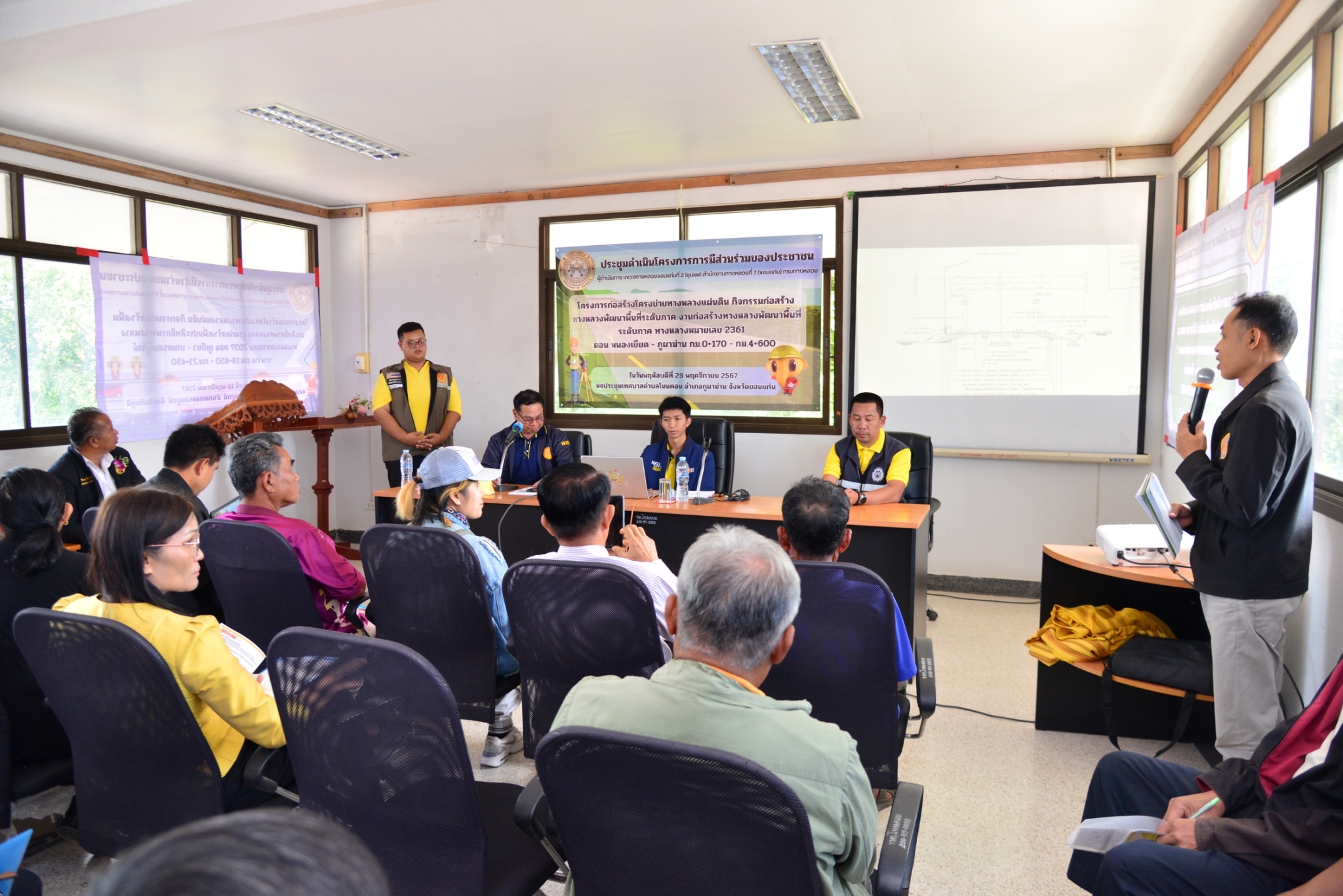 วันที่ 28  พฤศจิกายน 2567 นายประสพชัย ปรางค์ทอง ผู้อำนวยการแขวงทางหลวงขอนแก่นที่ 2 (ชุมแพ) และเจ้าหน้าที่แขวงทางหลวงขอนแก่นที่ 2 (ชุมแพ) ได้ประชุมดำเนินโครงการมีส่วนร่วมของประชาชน ประจำปีงบประมาณ 2568 ร่วมกับหน่วยงานที่เกี่ยวข้องทั้งภาครัฐ ผู้นำท้องถิ่น ผู้นำชุมชน และประชาชนในพื้นที่โครงการ “โครงการก่อสร้างโครงข่ายทางหลวงแผ่นดิน กิจกรรมก่อสร้างทางหลวงพัฒนาพื้นที่ระดับภาค งานก่อสร้างทางหลวงพัฒนาพื้นที่ระดับภาค ทางหลวงหมายเลข 2361 ตอนหนองเขียด - ภูผาม่าน กม.0+170 - กม.4+600“ นายวินัย สุทธิประภา รองผู้อำนวยการแขวงทางหลวงฝ่ายปฏิบัติการ และนายสุพงศ์ วิชัยพิบูลย์ วิศวกรโยธาปฏิบัติการ เป็นวิทยากรนำเสนอรายละเอียดรูปแบบของโครงการ ตลอดจนเปิดโอกาสให้ประชาชนได้ร่วมแสดงความคิดเห็น ข้อเสนอแนะต่างๆ อันจะเป็นประโยชน์ต่อการดำเนินโครงการ ซึ่งในที่ประชุมมีมติเห็นด้วยกับโครงการก่อสร้างดังกล่าว