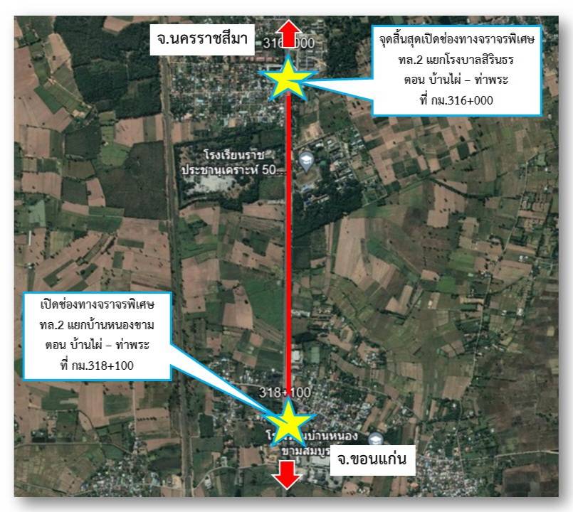 #ปิดช่องทางจราจร ทางหลวงหมายเลข 2 ตอน บ้านไผ่ - ท่าพระ เพื่อดำเนินการซ่อมแซมความเสียหายคอสะพานชำรุด ที่กม. 317+300 (ด้านขวาทาง) โดย เปิดช่องทางพิเศษ ที่ กม.318+100 (แยกบ้านหนองขาม) ถึง กม.316+000 (แยก รพ.สิรินธร) ระยะทาง 2.100 กม. เริ่มตั้งแต่วันที่ 31 กรกฎาคม 2567 เวลา 14.00 น. เป็นต้นไป จนกว่างานจะแล้วเสร็จ