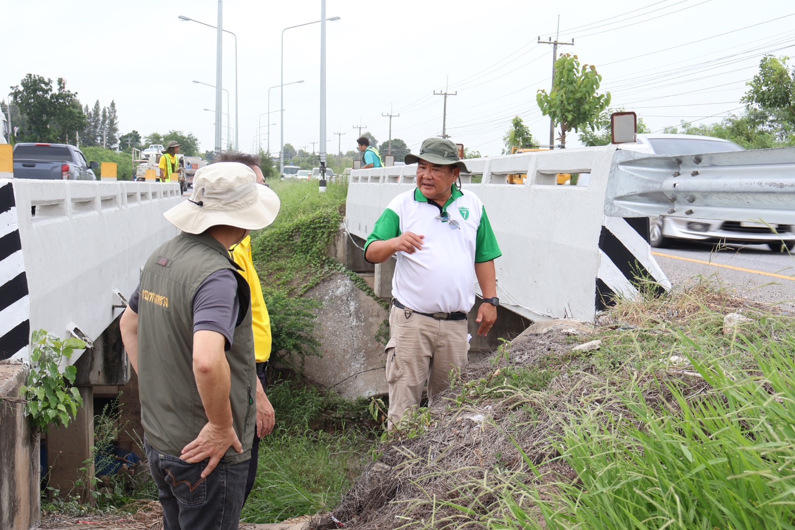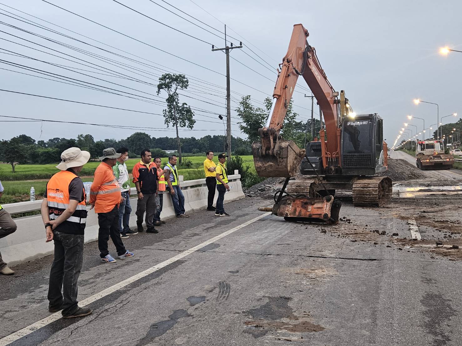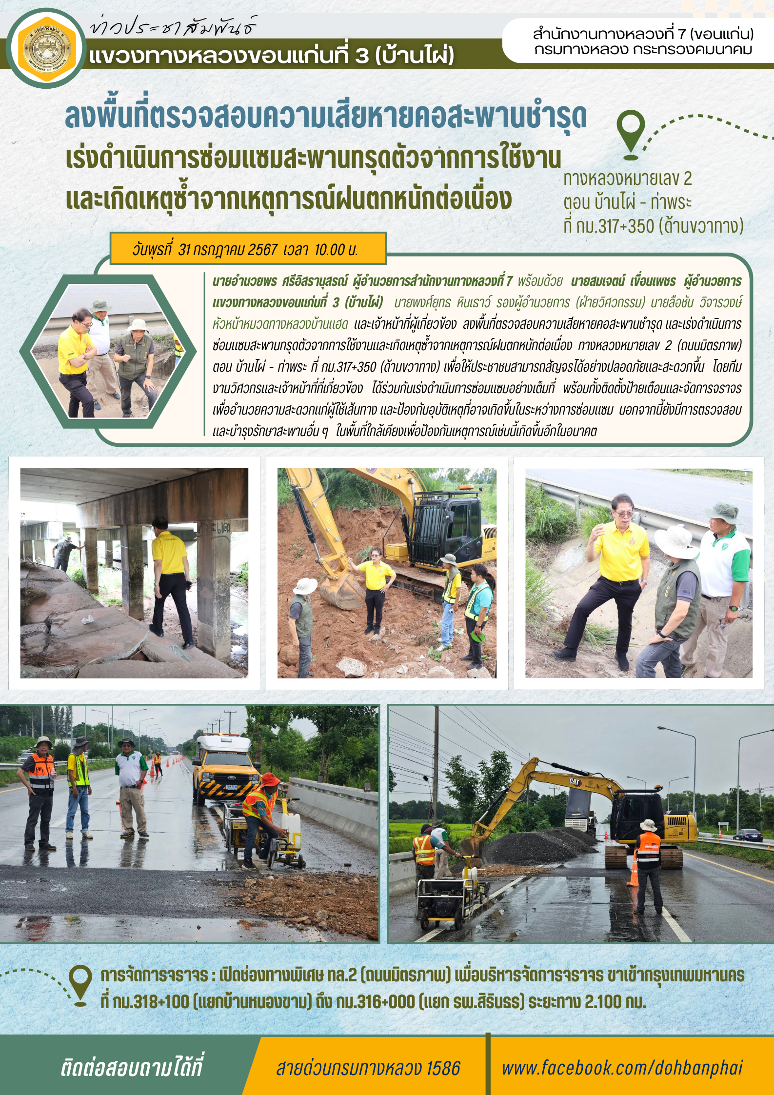 #นายอำนวยพร ศรีอิสรานุสรณ์ ผู้อำนวยการสำนักงานทางหลวงที่ 7 พร้อมด้วย นายสมเจตน์ เขื่อนเพชร ผู้อำนวยการแขวงทางหลวงขอนแก่นที่ 3 (บ้านไผ่) นายพงศ์ยุทธ หินเธาว์ รองผู้อำนวยการ (ฝ่ายวิศวกรรม) นายลือชัน วิจารวงษ์ หัวหน้าหมวดทางหลวงบ้านแฮด และเจ้าหน้าที่ผู้เกี่ยวข้อง ลงพื้นที่ตรวจสอบความเสียหายคอสะพานชำรุด และเร่งดำเนินการซ่อมแซมสะพานทรุดตัวจากการใช้งานและเกิดเหตุซ้ำจากเหตุการณ์ฝนตกหนักต่อเนื่อง ทางหลวงหมายเลข 2 (ถนนมิตรภาพ) ตอน บ้านไผ่ - ท่าพระ ที่ กม.317+350 (ด้านขวาทาง) เพื่อให้ประชาชนสามารถสัญจรได้อย่างปลอดภัยและสะดวกขึ้น โดยทีมงานวิศวกรและเจ้าหน้าที่ที่เกี่ยวข้อง ได้ร่วมกันเร่งดำเนินการซ่อมแซมอย่างเต็มที่ พร้อมทั้งติดตั้งป้ายเตือนและจัดการจราจรเพื่ออำนวยความสะดวกแก่ผู้ใช้เส้นทาง และป้องกันอุบัติเหตุที่อาจเกิดขึ้นในระหว่างการซ่อมแซม นอกจากนี้ยังมีการตรวจสอบและบำรุงรักษาสะพานอื่น ๆ ในพื้นที่ใกล้เคียงเพื่อป้องกันเหตุการณ์เช่นนี้เกิดขึ้นอีกในอนาคต