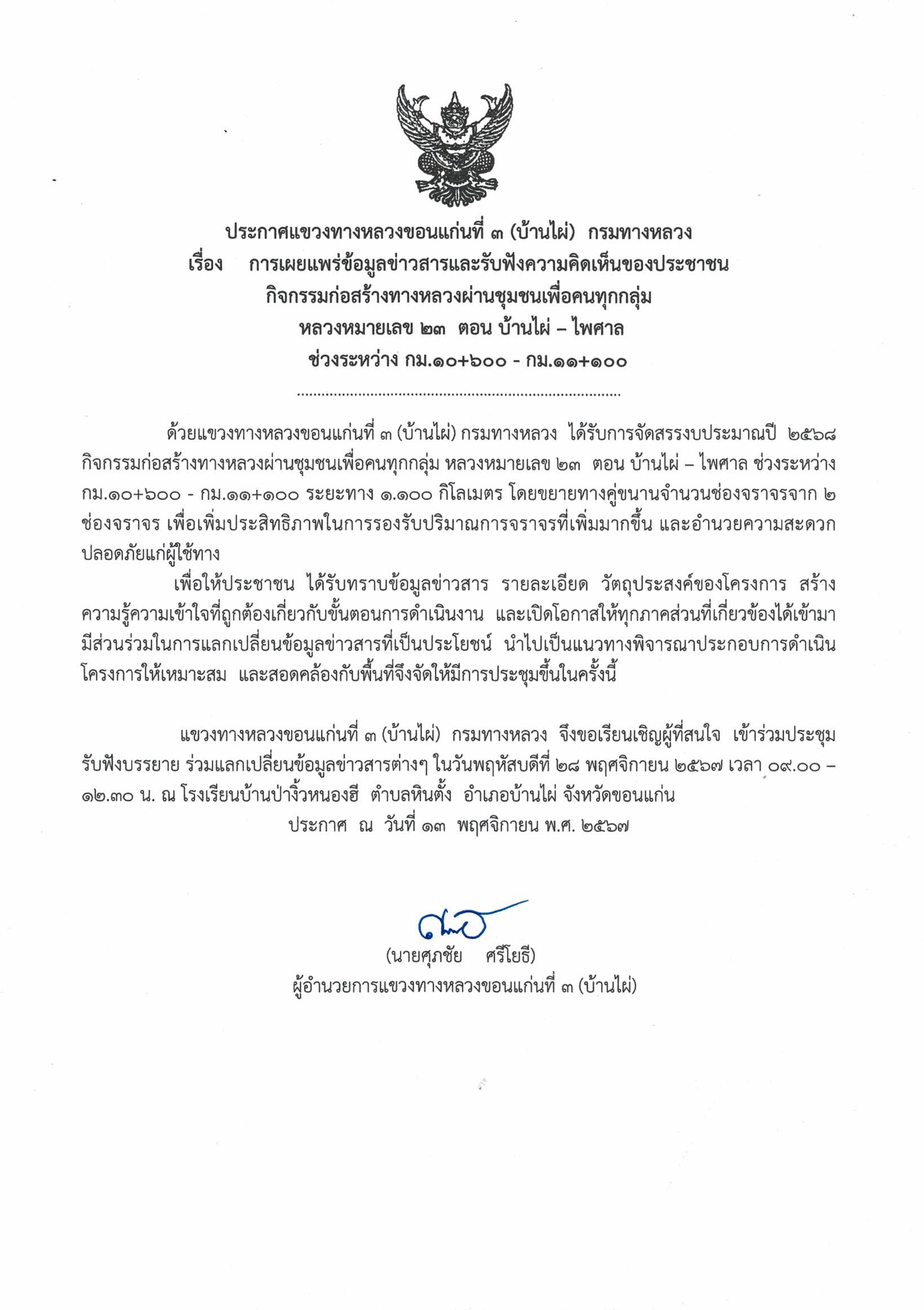 ประกาศแขวงทางหลวงขอนแก่นที่ 3 (บ้านไผ่) กรมทางหลวง