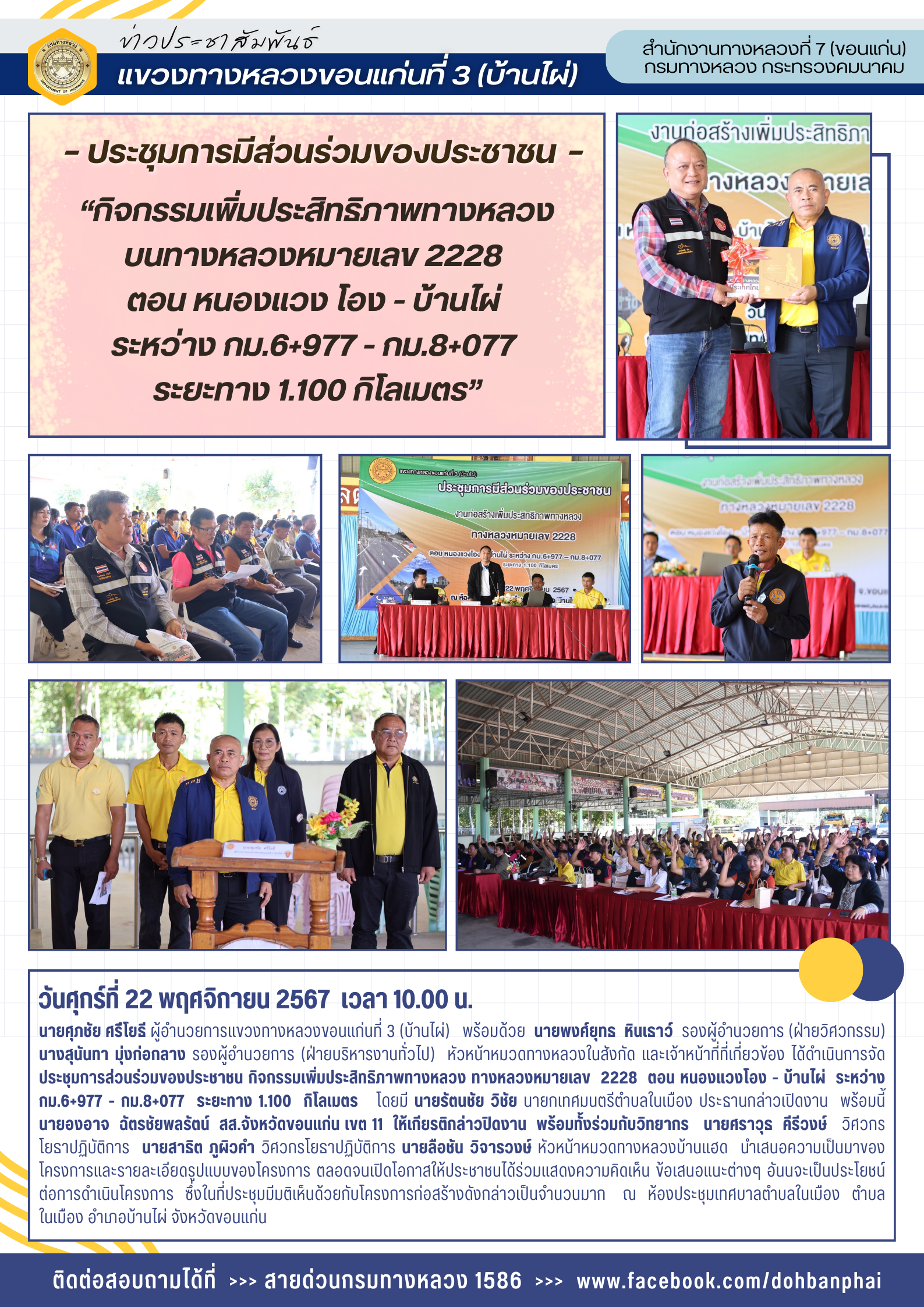 #ประชุมการส่วนร่วมของประชาชน กิจกรรมเพิ่มประสิทธิภาพทางหลวง ทางหลวงหมายเลข 2228 ตอน หนองแวงโอง - บ้านไผ่ ระหว่าง กม.6+977 - กม.8+077 ระยะทาง 1.100 กิโลเมตร