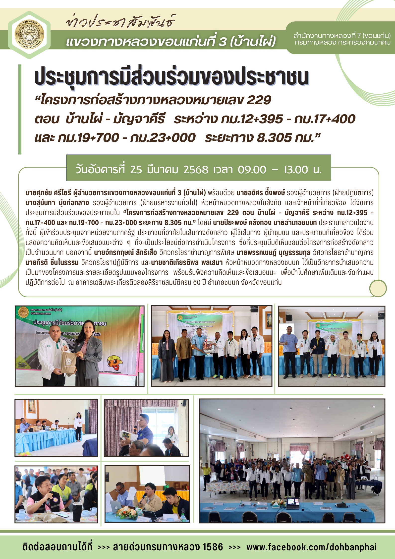 #นายศุภชัย ศรีโยธี ผู้อำนวยการแขวงทางหลวงขอนแก่นที่ 3 (บ้านไผ่) พร้อมด้วย นายอดิศร ตั้งพงษ์ รองผู้อำนวยการ (ฝ่ายปฏิบัติการ) นางสุนันทา มุ่งก่อกลาง รองผู้อำนวยการ (ฝ่ายบริหารงานทั่วไป) หัวหน้าหมวดทางหลวงในสังกัด และเจ้าหน้าที่ที่เกี่ยวข้อง ได้จัดการประชุมการมีส่วนร่วมของประชาชนใน “โครงการก่อสร้างทางหลวงหมายเลข 229 ตอน บ้านไผ่ - มัญจาคีรี ระหว่าง กม.12+395 - กม.17+400 และ กม.19+700 - กม.23+000 ระยะทาง 8.305 กม.” โดยมี นายปิยะพงษ์ คลังทอง นายอำเภอชนบท ประธานกล่าวเปิดงาน ทั้งนี้ ผู้เข้าร่วมประชุมจากหน่วยงานภาครัฐ ประชาชนที่อาศัยในเส้นทางดังกล่าว ผู้ใช้เส้นทาง ผู้นำชุมชน และประชาชนที่เกี่ยวข้อง ได้ร่วมแสดงความคิดเห็นและข้อเสนอแนะต่าง ๆ ที่จะเป็นประโยชน์ต่อการดำเนินโครงการ ซึ่งที่ประชุมมีมติเห็นชอบต่อโครงการก่อสร้างดังกล่าวเป็นจำนวนมาก นอกจากนี้ นายจักรกฤษณ์ สิทธิเสือ วิศวกรโยธาชำนาญการพิเศษ นายพรรคเชษฎ์ บุญธรรมกุล วิศวกรโยธาชำนาญการ นายกีรติ ชื่นในธรรม วิศวกรโยธาปฏิบัติการ และนายชาติเกียรติพล พลเสนา หัวหน้าหมวดทางหลวงชนบท ได้เป็นวิทยากรนำเสนอความเป็นมาของโครงการและรายละเอียดรูปแบบของโครงการ พร้อมรับฟังความคิดเห็นและข้อเสนอแนะ เพื่อนำไปศึกษาเพิ่มเติมและจัดทำแผนปฏิบัติการต่อไป  ณ อาคารเฉลิมพระเกียรติฉลองสิริราชสมบัติครบ 60 ปี อำเภอชนบท จังหวัดขอนแก่น