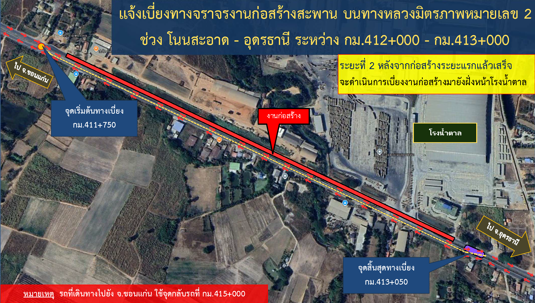 เบี่ยงการจราจร งานฟื้นฟูทางหลวง ทางหลวงหมายเลข 2 ตอน โนนสะอาด - อุดรธานี ระหว่าง กม.411+850 (LT.,RT.) - กม.413+000 (LT.,RT.)