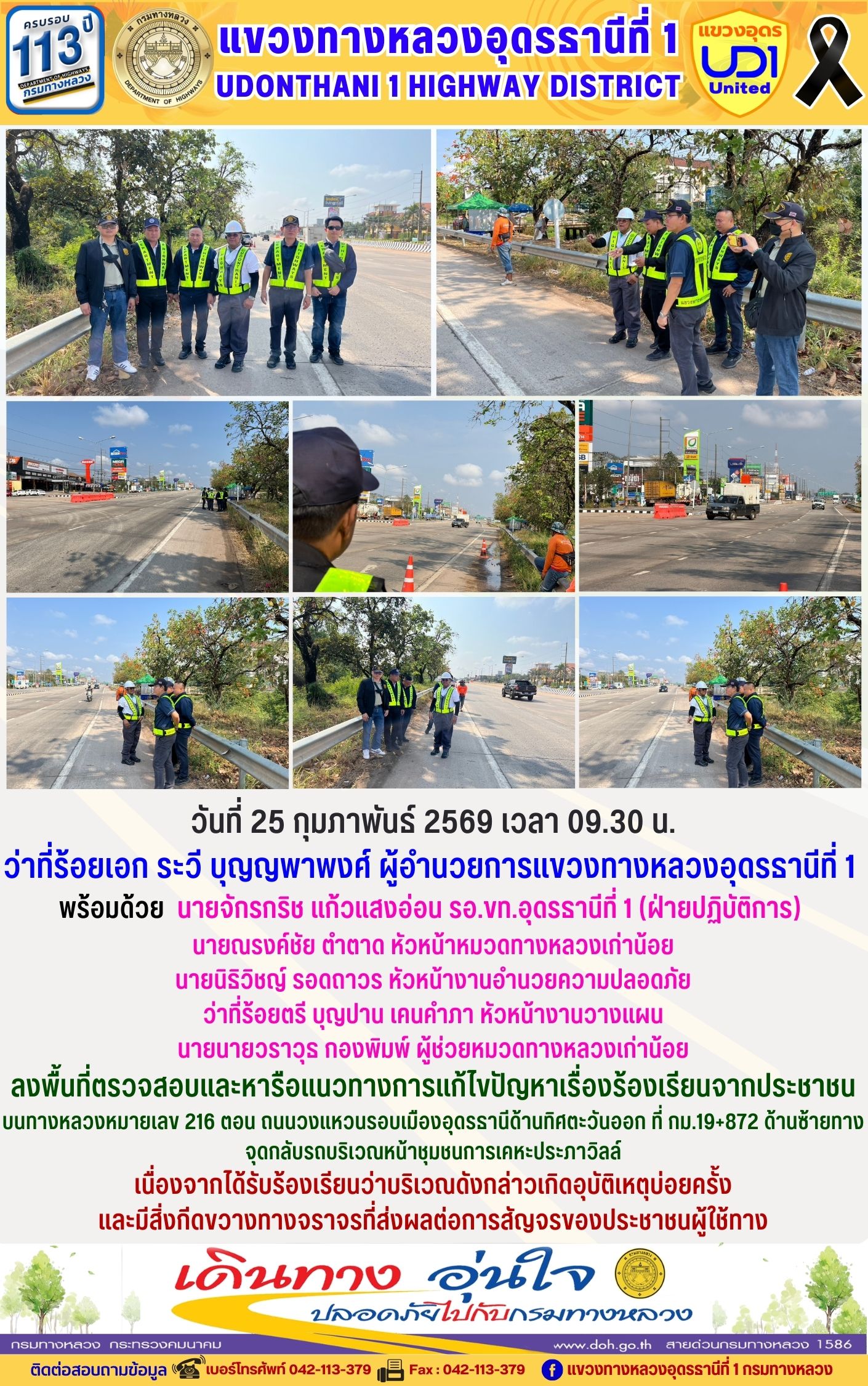 ลงพื้นที่ตรวจสอบและหารือแนวทางการแก้ไขปัญหาเรื่องร้องเรียนจากประชาชน บนทางหลวงหมายเลข 216 ตอน ถนนวงแหวนรอบเมืองอุดรธานีด้านทิศตะวันออก ที่ กม.19+872 ด้านซ้ายทาง จุดกลับรถบริเวณหน้าชุมชนการเคหะประภาวิลล์