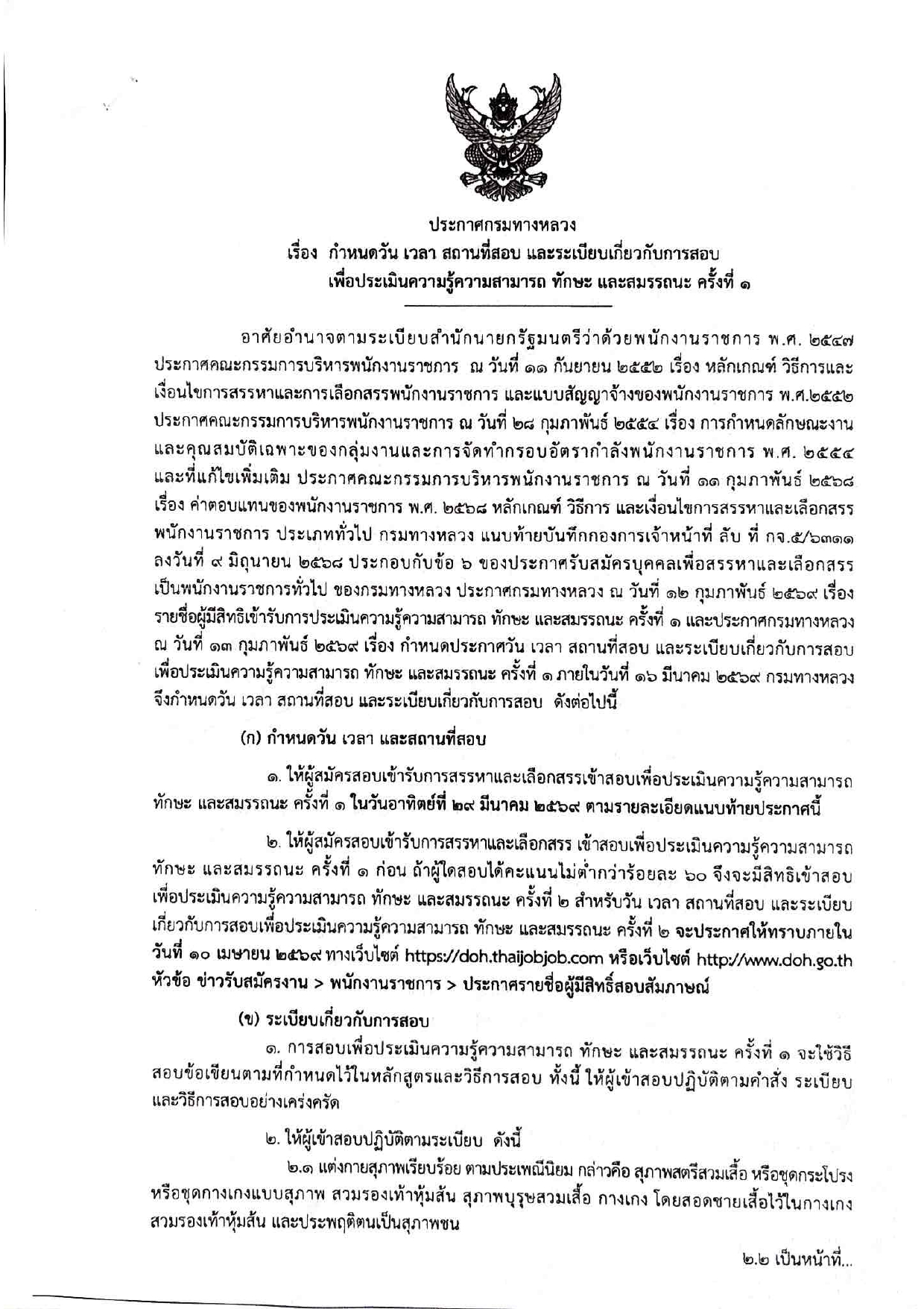 ประกาศกรมทางหลวง เรื่อง กำหนดวัน เวลา สถานที่สอบ และระเบียบเกี่ยวกับการสอบ เพื่อประเมินความรู้ความสามารถ ทักษะ และสมรรถนะ ครั้งที่ ๑ พนักงานราชการทั่วไป ของกรมทางหลวง