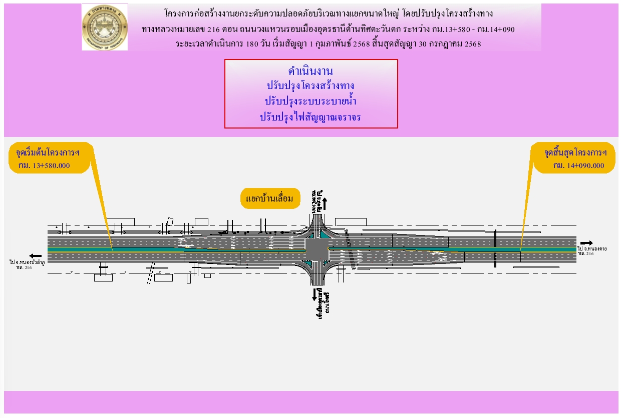 การเบี่ยงการจราจร งานยกระดับความปลอดภัยบริเวณทางแยกขนาดใหญ่ ทางหลวงหมายเลข 216 ตอน ถนนวงแหวนรอบเมืองอุดรธานีด้านทิศตะวันตก ระหว่าง กม.13+580 - กม.14+090