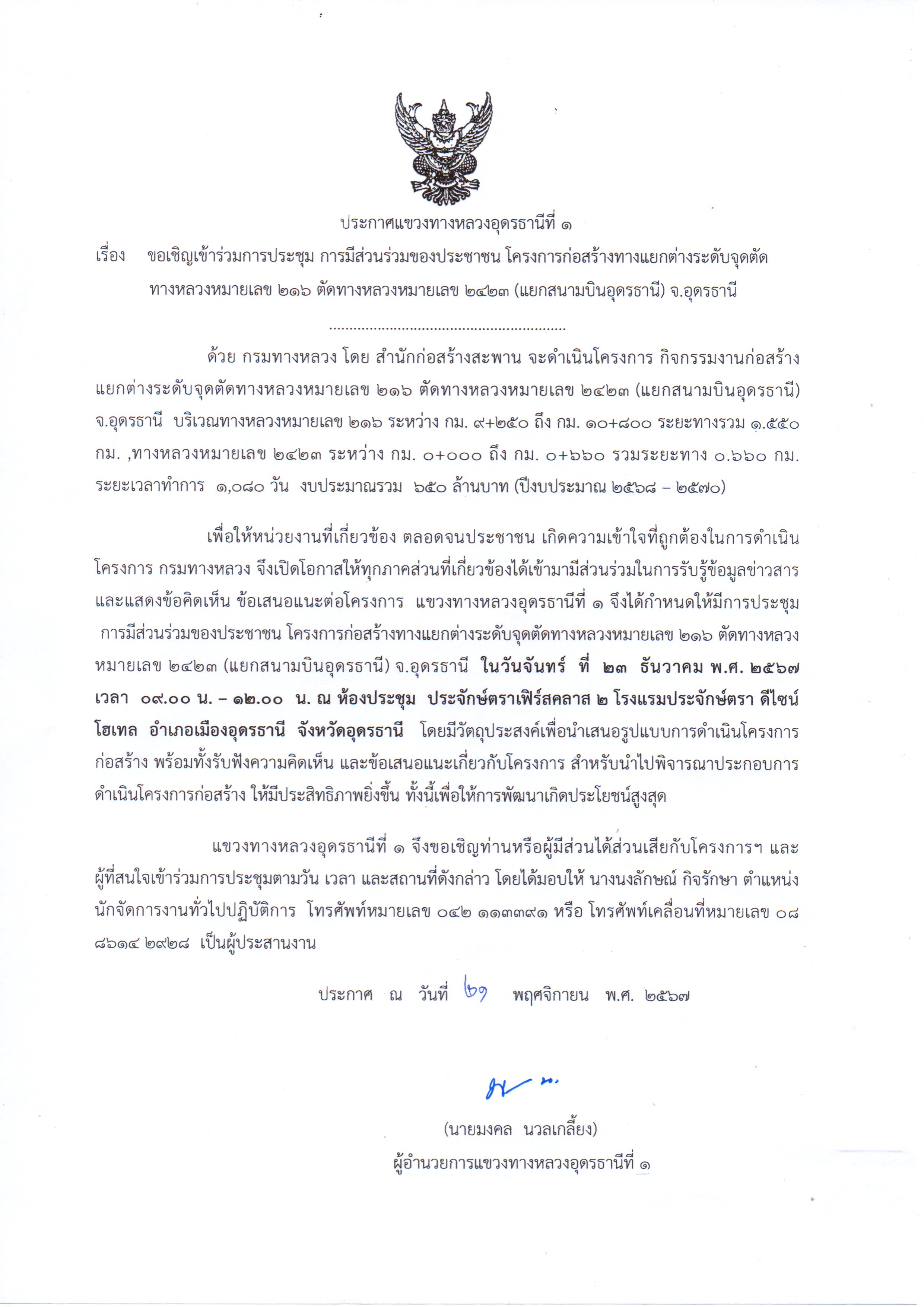 ขอเชิญประชาชนทุกท่านเข้าร่วมประชุม โครงก?ารประชุมการมีส่วนร่วมของประชาชน โครงการก่อสร้างทางแยกต่างระดับจุดตัดทางหลวงหมายเลข 216 ตัดทางหลวงหมายเลข 2423 (แยกสนามบินอุดรธานี)