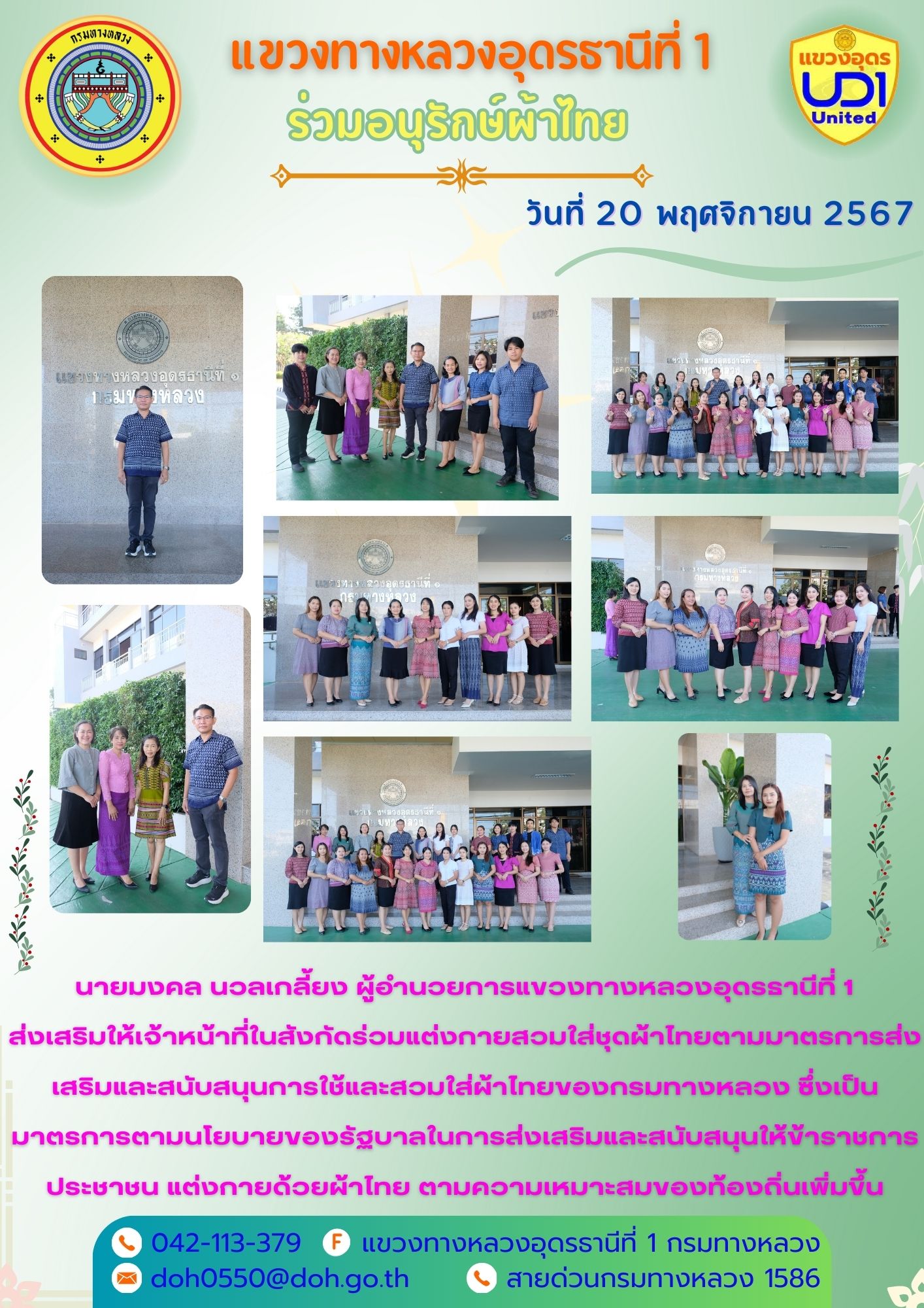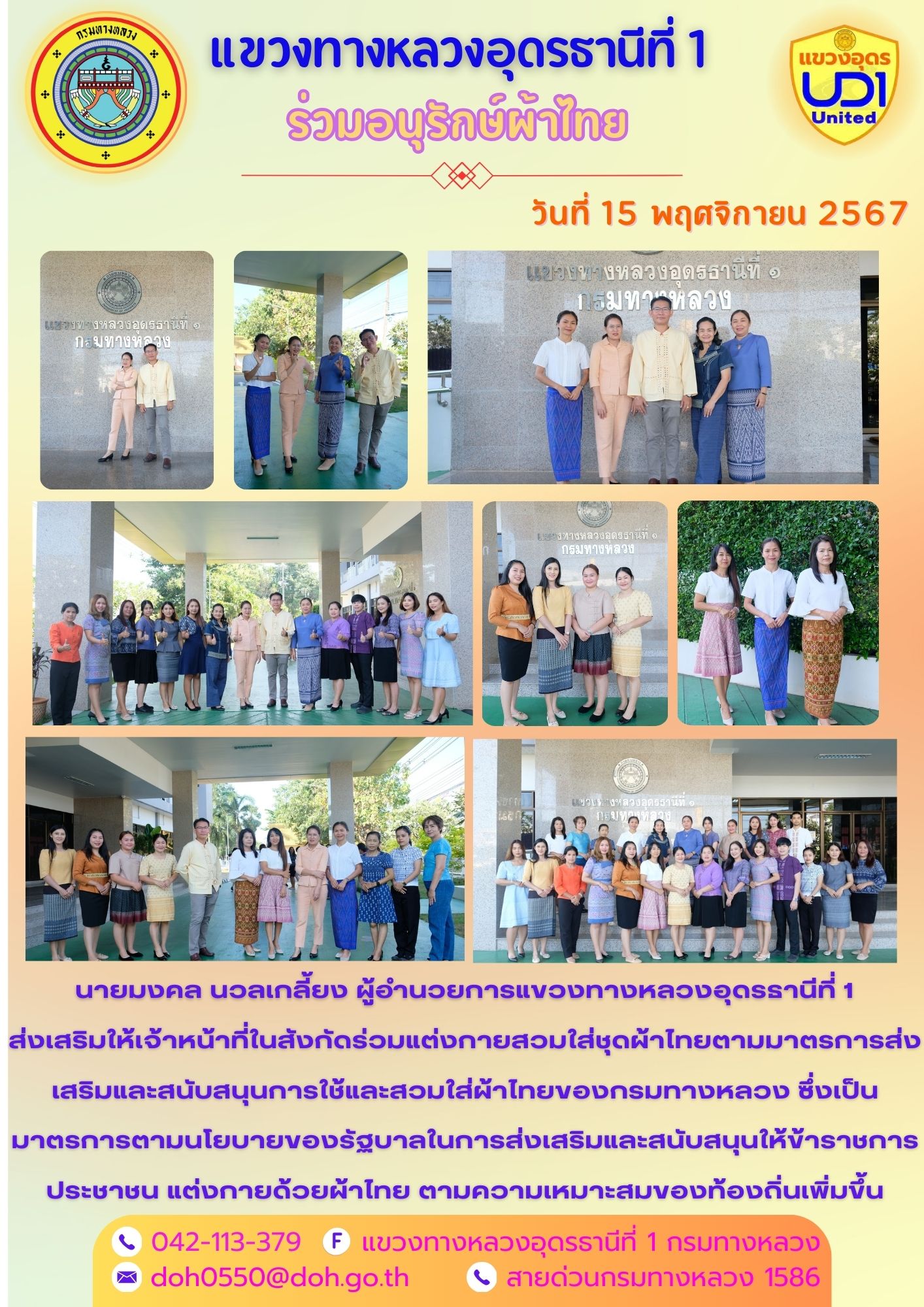 นายมงคล นวลเกลี้ยง ผู้อำนวยการแขวงทางหลวงอุดรธานีที่ 1 ส่งเสริมให้เจ้าหน้าที่ในสังกัดร่วมแต่งกายสวมใส่ชุดผ้าไทยตามมาตรการส่งเสริมและสนับสนุนการใช้และสวมใส่ผ้าไทยของกรมทางหลวง ซึ่งเป็นมาตรการตามนโยบายของรัฐบาลในการส่งเสริมและสนับสนุนให้ข้าราชการ ประชาชน แต่งกายด้วยผ้าไทย ตามความเหมาะสมของท้องถิ่นเพิ่มขึ้น