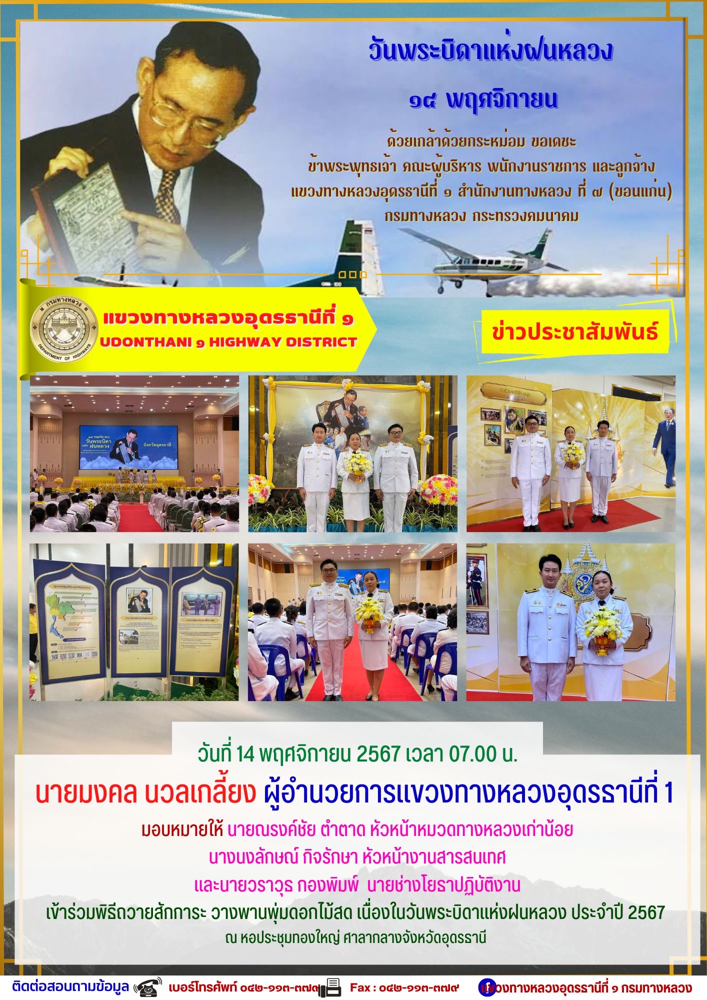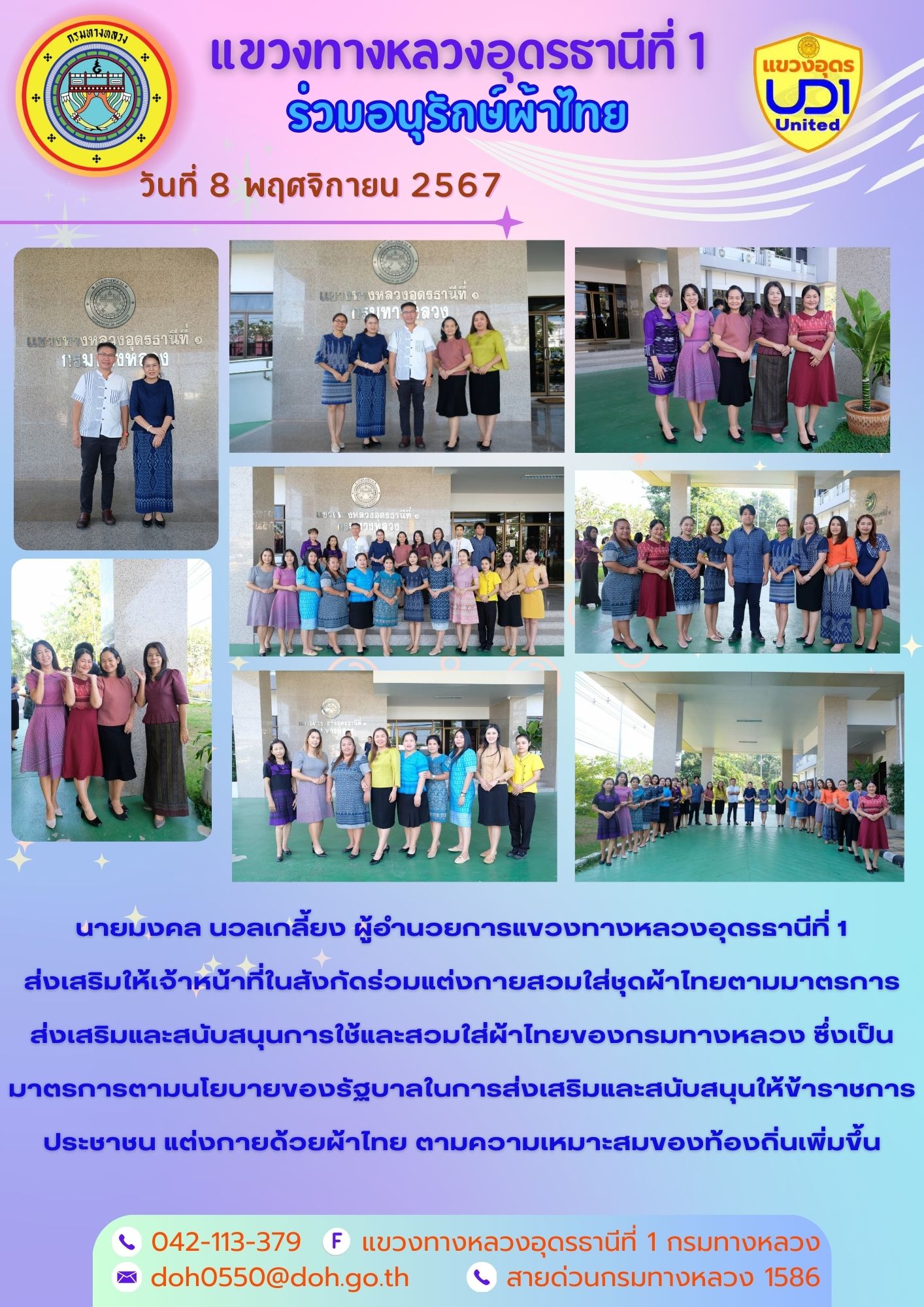 นายมงคล นวลเกลี้ยง ผู้อำนวยการแขวงทางหลวงอุดรธานีที่ 1 และเจ้าหน้าที่ในสังกัดร่วมแต่งกายสวมใส่ชุดผ้าไทยตามมาตรการส่งเสริมให้เจ้าหน้าที่ในสังกัดร่วมแต่งกายสวมใส่ชุดผ้าไทยตามมาตรการส่งเสริมและสนับสนุนการใช้และสวมใส่ผ้าไทยของกรมทางหลวง ซึ่งเป็นมาตรการตามนโยบายของรัฐบาลในการส่งเสริมและสนับสนุนให้ข้าราชการ ประชาชน แต่งกายด้วยผ้าไทย ตามความเหมาะสมของท้องถิ่นเพิ่มขึ้น