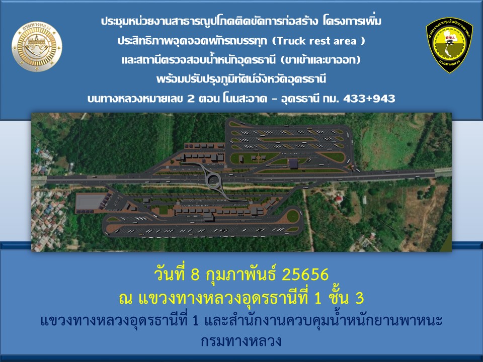 ประชุมหน่วยงานสาธารณูปโภคติดขัดการก่อสร้าง โครงการเพิ่มประสิทธิภาพจุดจอดพักรถบรรทุก (Truck rest area ) และสถานีตรวจสอบน้ำหนักอุดรธานี (ขาเข้าและขาออก) พร้อมปรับปรุงภูมิทัศน์จังหวัดอุดรธานี