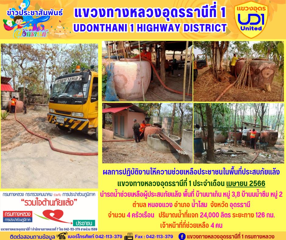 ผลการปฏิบัติงานให้ความช่วยเหลือประชาชนในพื้นที่ประสบภัยแล้ง แขวงทางหลวงอุดรธานีที่ 1 ประจำเดือน เมษายน 2566