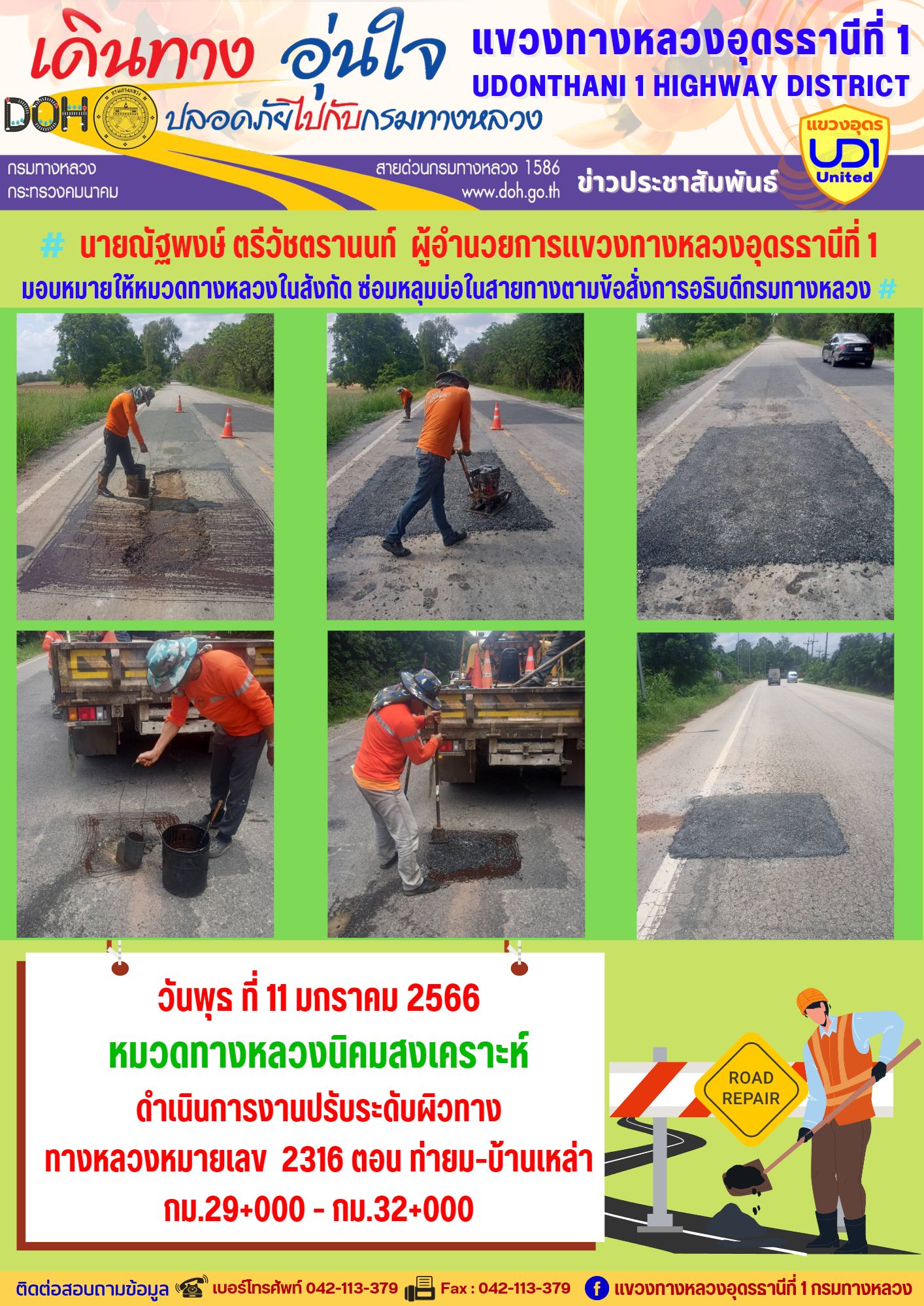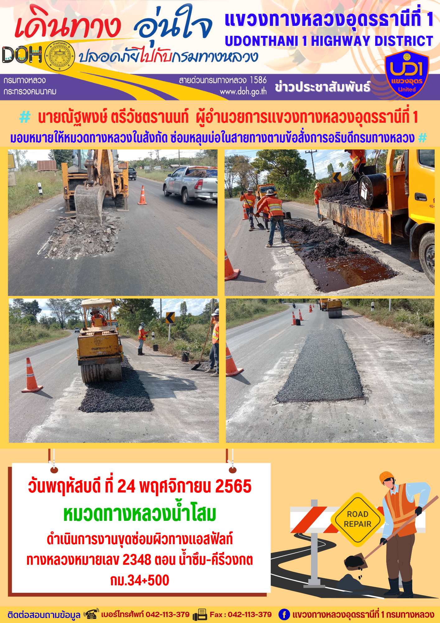 นายณัฐพงษ์ ตรีวัชตรานนท์ ผู้อำนวยการแขวงทางหลวงอุดรธานีที่ 1 มอบหมายให้หมวดทางหลวงในสังกัด ซ่อมหลุมบ่อในสายทางตามข้อสั่งการอธิบดีกรมทางหลวง