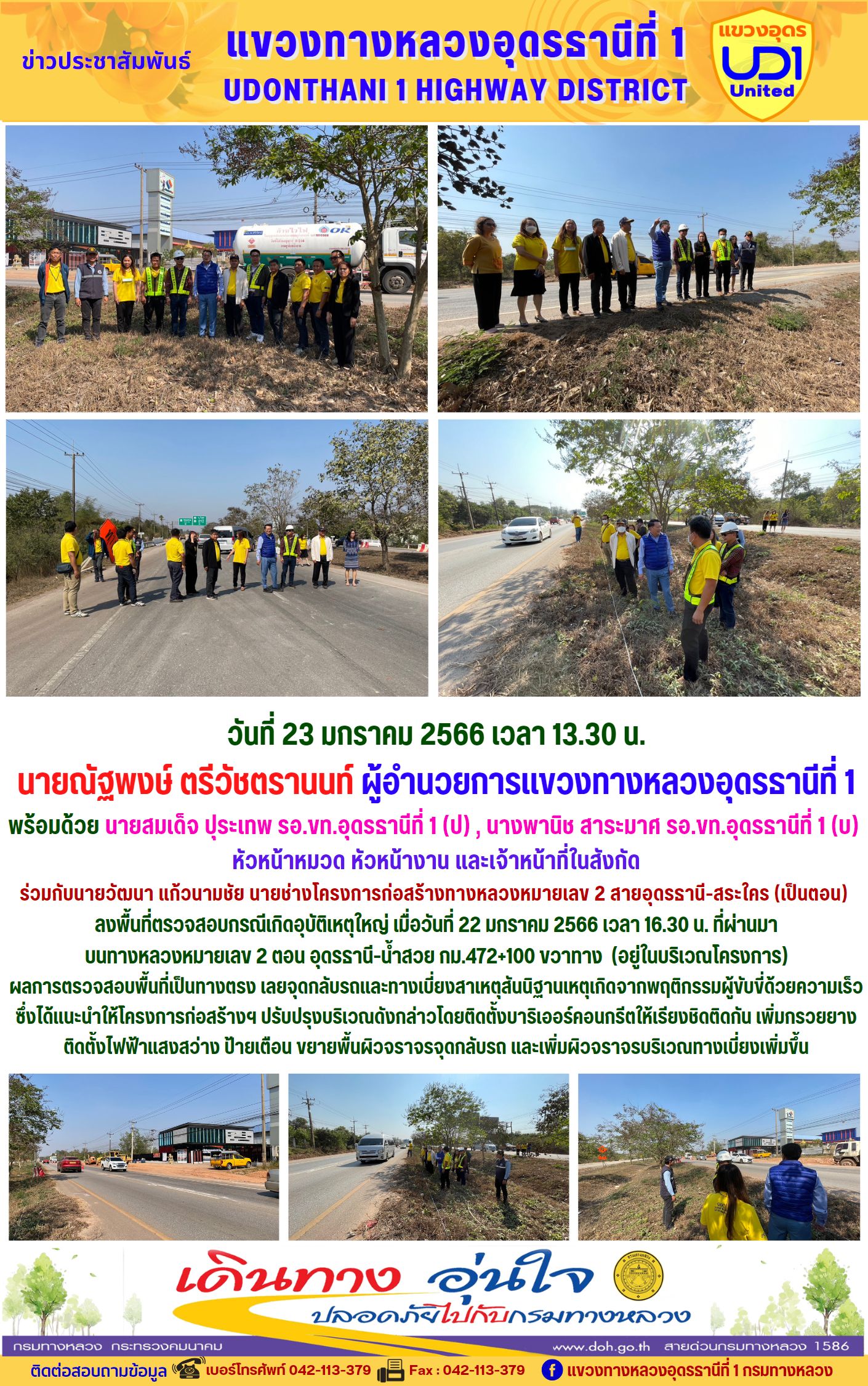 ลงพื้นที่ตรวจสอบกรณีเกิดอุบัติเหตุใหญ่ เมื่อวันที่ 22 มกราคม 2566 เวลา 16.30 น. ที่ผ่านมา บนทางหลวงหมายเลข 2 ตอน อุดรธานี-น้ำสวย กม.472+100 ขวาทาง (อยู่ในบริเวณโครงการ)
