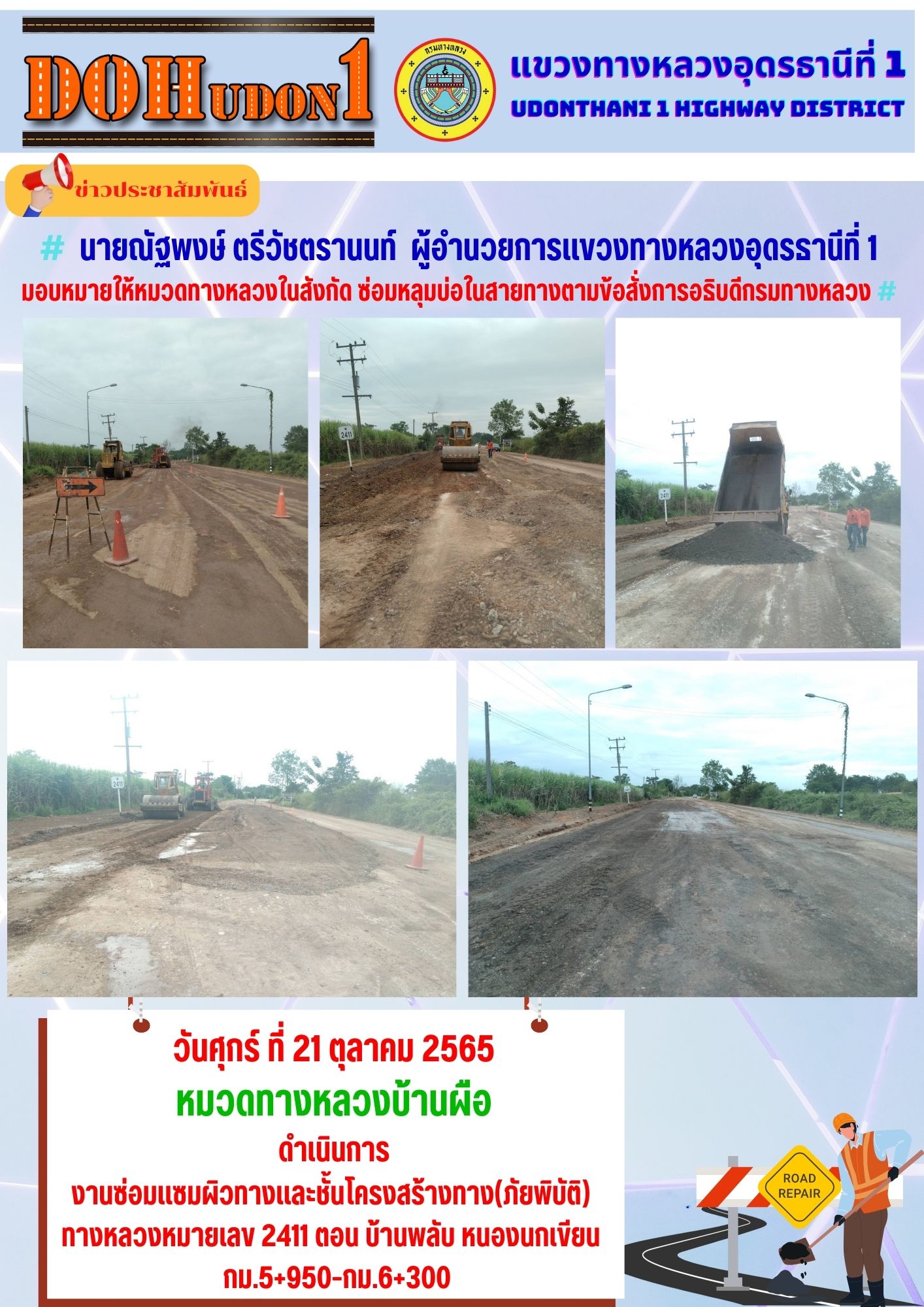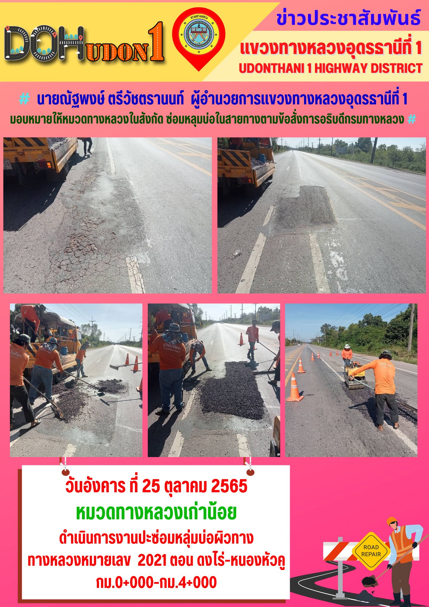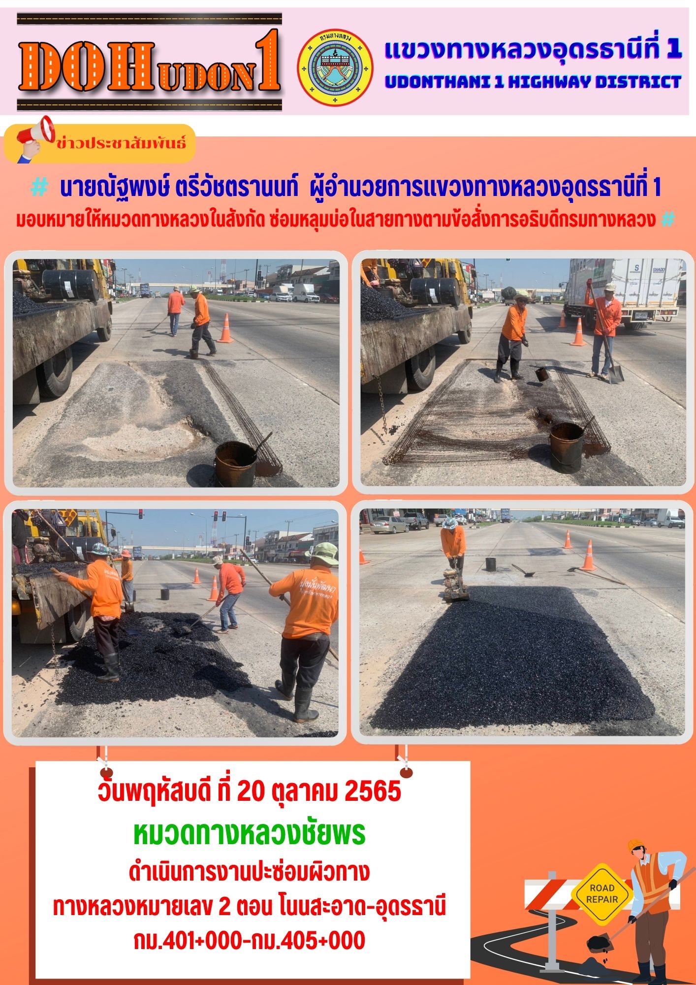 นายณัฐพงษ์ ตรีวัชตรานนท์ ผู้อำนวยการแขวงทางหลวงอุดรธานีที่ 1 มอบหมายให้หมวดทางหลวงในสังกัด ซ่อมหลุมบ่อในสายทางตามข้อสั่งการอธิบดีกรมทางหลวง