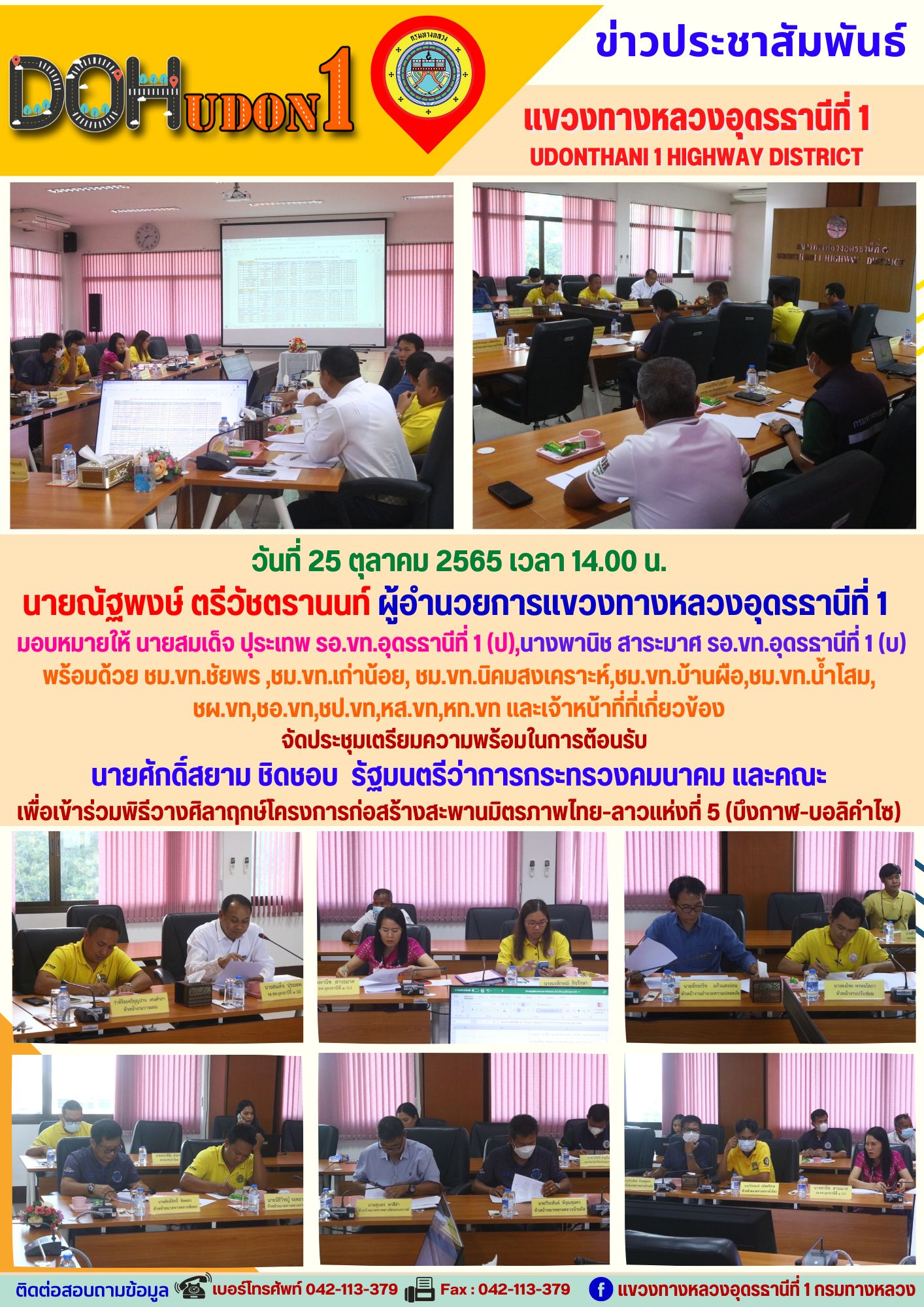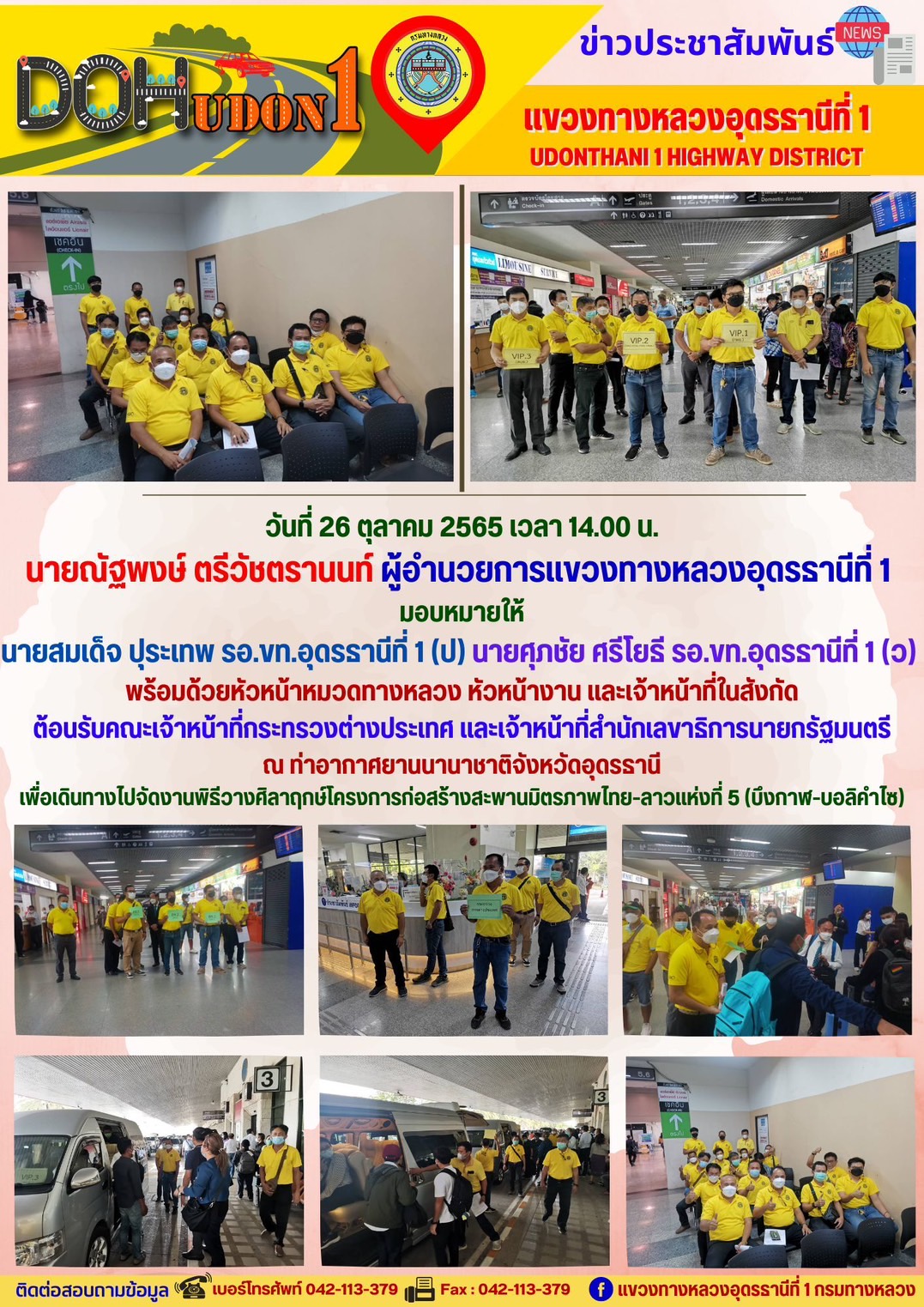 นายณัฐพงษ์ ตรีวัชตรานนท์ ผู้อำนวยการแขวงทางหลวงอุดรธานีที่ 1 มอบหมายให้ นางพานิช สาระมาศ รอ.ขท.อุดรธานีที่ 1 (บ) เป็นตัวแทนแขวงทางหลวงอุดรธานีที่ 1 ดูแลคณะเจ้าหน้าที่จากสำนักงานเลขารัฐมนตรี กระทรวงคมนาคม ที่เดินทางมาตรวจราชการที่จังหวัดอุดรธานีและจังหวัดบึงกาฬ พิธีวางศิลาฤกษ์โครงการก่อสร้างสะพานมิตรภาพไทย-ลาวแห่งที่ 5 (บึงกาฬ-บอลิคำไซ)