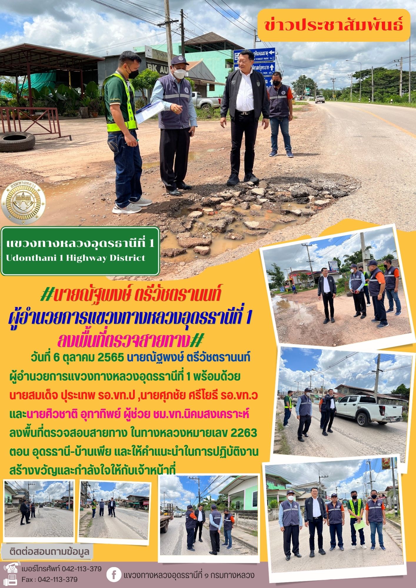 ลงพื้นที่สำรวจวามเสียหายของโครงสร้างทาง เพื่อประกอบการวางแผนการซ่อมบำรุงทางหลวง ทางหลวงหมายเลข 22 ตอน อุดรธานี-หนองขาม ตามนโยบายของอธิบดีกรมทางหลวง และรับฟังคำชี้แนะของประชาชน
