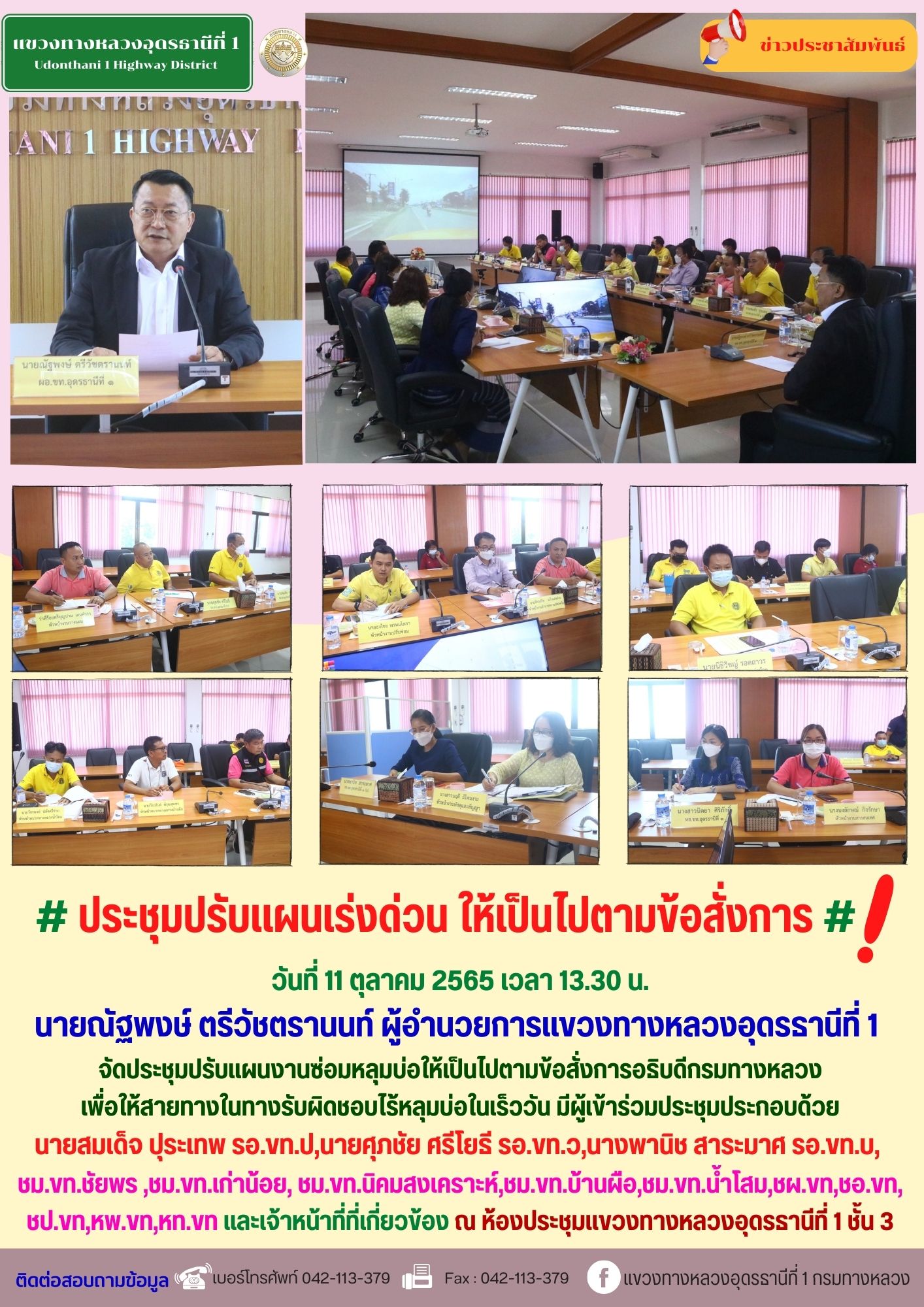 นายณัฐพงษ์ ตรีวัชตรานนท์ ผู้อำนวยการแขวงทางหลวงอุดรธานีที่ 1 มอบหมายให้หมวดทางหลวงในสังกัด ซ่อมหลุมบ่อในสายทางตามข้อสั่งการอธิบดีกรมทางหลวง