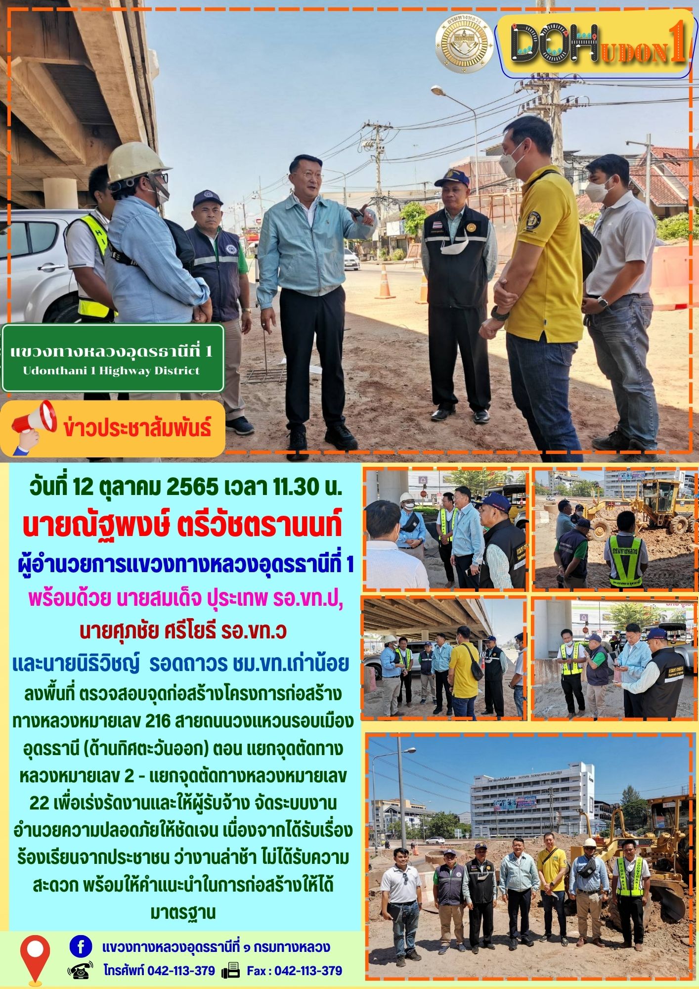 ลงพื้นที่โครงการก่อสร้างทางหลวงหมายเลข 216 สายวงแหวนรอบเมืองอุดรธานี (ด้านทิศตะวันออก) ตอนเเยกจุดตัดทางหลวงหมายเลข 2 - แยกจุดตัดทางหลวงหมายเลข 22 เพื่อเร่งรัดงานก่อสร้างที่ล่าช้าและดำเนินการก่อสร้างให้ได้ตามแบบและมาตรฐานกรมทางหลวง