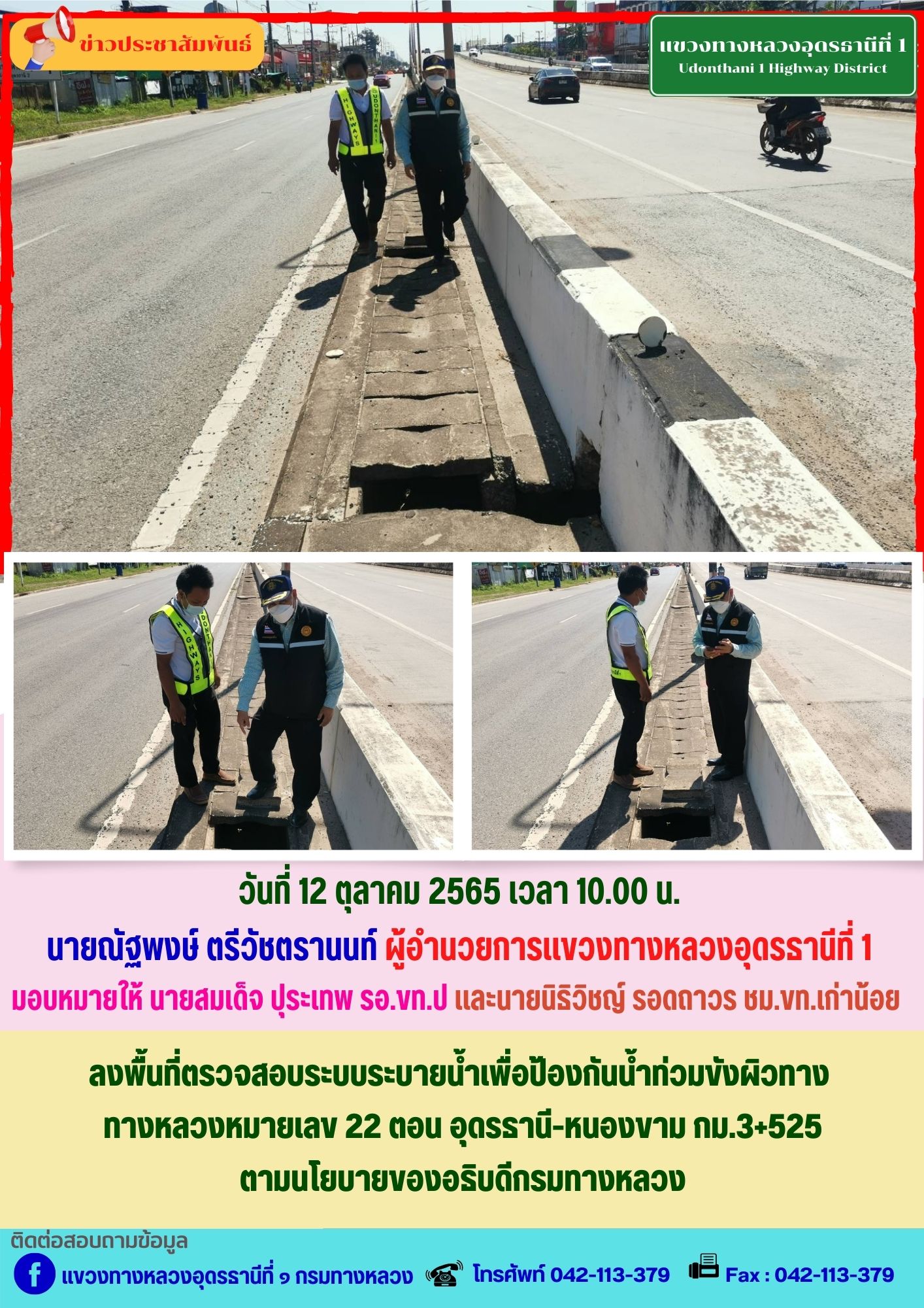 ลงพื้นที่ตรวจสอบระบบระบายน้ำเพื่อป้องกันน้ำท่วมขังผิวทาง ทางหลวงหมายเลข 22 ตอน อุดรธานี-หนองขาม กม.3+525 ตามนโยบายของอธิบดีกรมทางหลวง