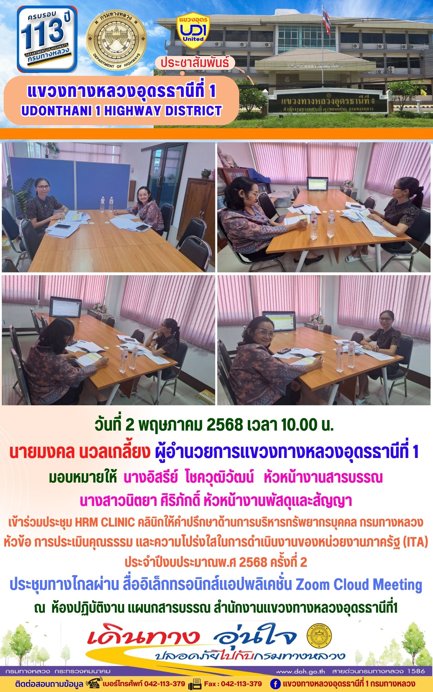 เข้าร่วมประชุม HRM CLINIC คลินิกให้คำปรึกษาด้านการบริหารทรัพยากรบุคคล กรมทางหลวง หัวข้อ การประเมินคุณธรรม และความโปร่งใสในการดำเนินงานของหน่วยงานภาครัฐ (ITA) ประจำปีงบประมาณพ.ศ 2568 ครั้งที่ 2