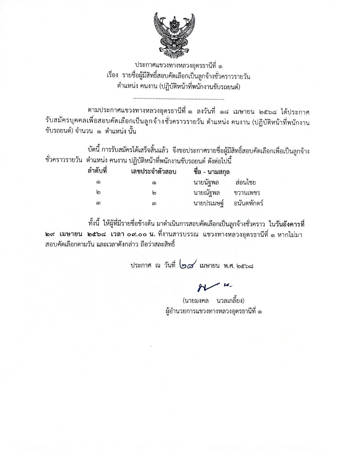 ประกาศแขวงทางหลวงอุดรธานีที่ ๑ เรื่อง รายชื่อผู้มีสิทธิ์สอบคัดเลือกเป็นลูกจ้างชั่วคราวรายวัน