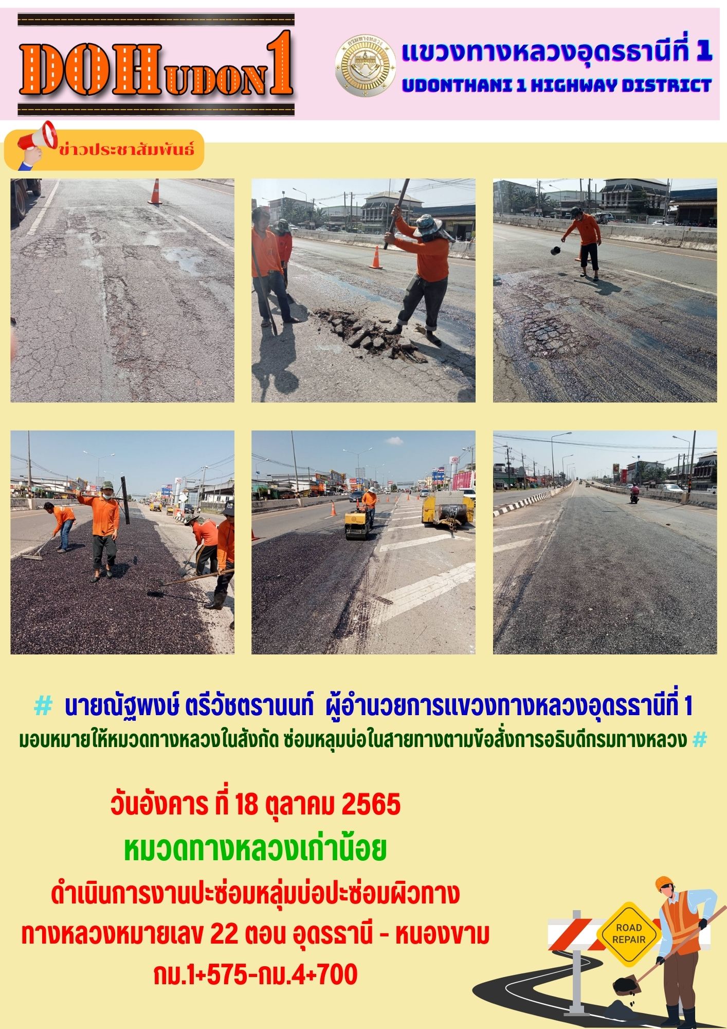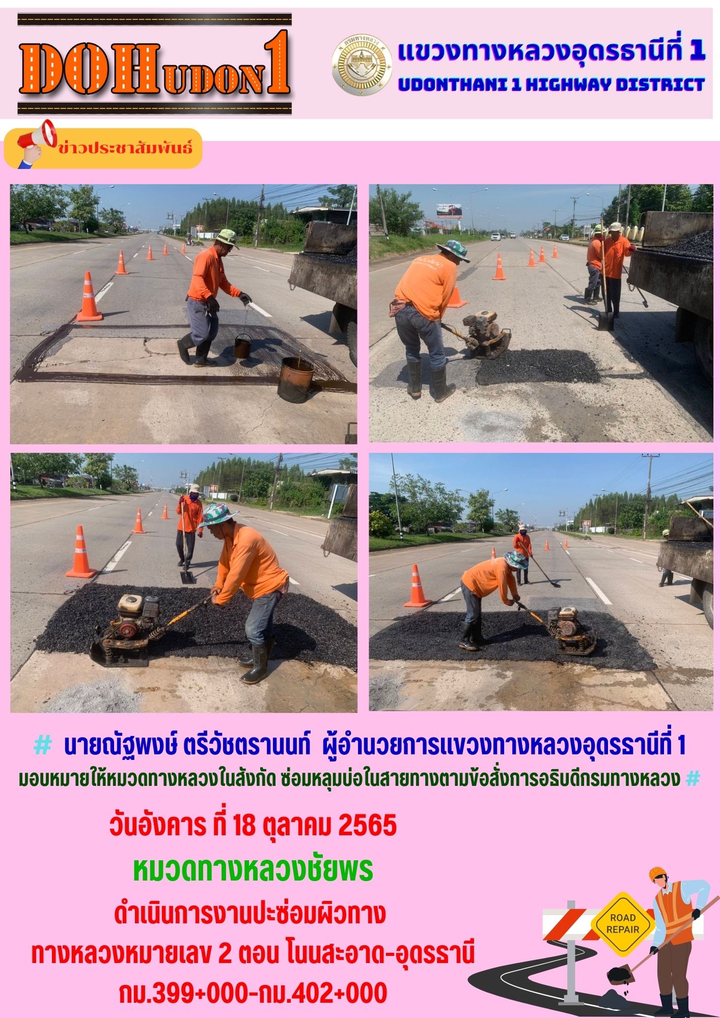นายณัฐพงษ์ ตรีวัชตรานนท์ ผู้อำนวยการแขวงทางหลวงอุดรธานีที่ 1 มอบหมายให้หมวดทางหลวงในสังกัด ซ่อมหลุมบ่อในสายทางตามข้อสั่งการอธิบดีกรมทางหลวง