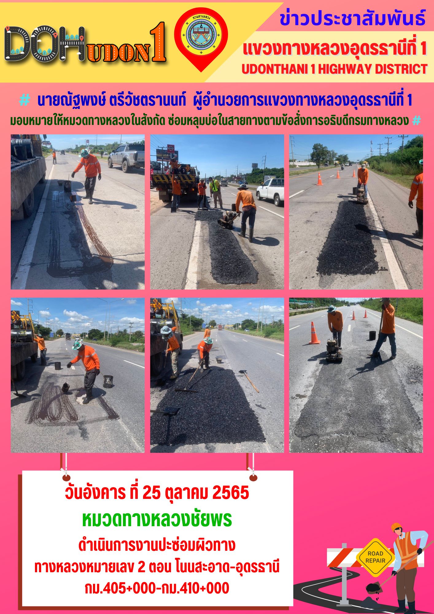 นายณัฐพงษ์ ตรีวัชตรานนท์ ผู้อำนวยการแขวงทางหลวงอุดรธานีที่ 1 มอบหมายให้หมวดทางหลวงในสังกัด ซ่อมหลุมบ่อในสายทางตามข้อสั่งการอธิบดีกรมทางหลวง
